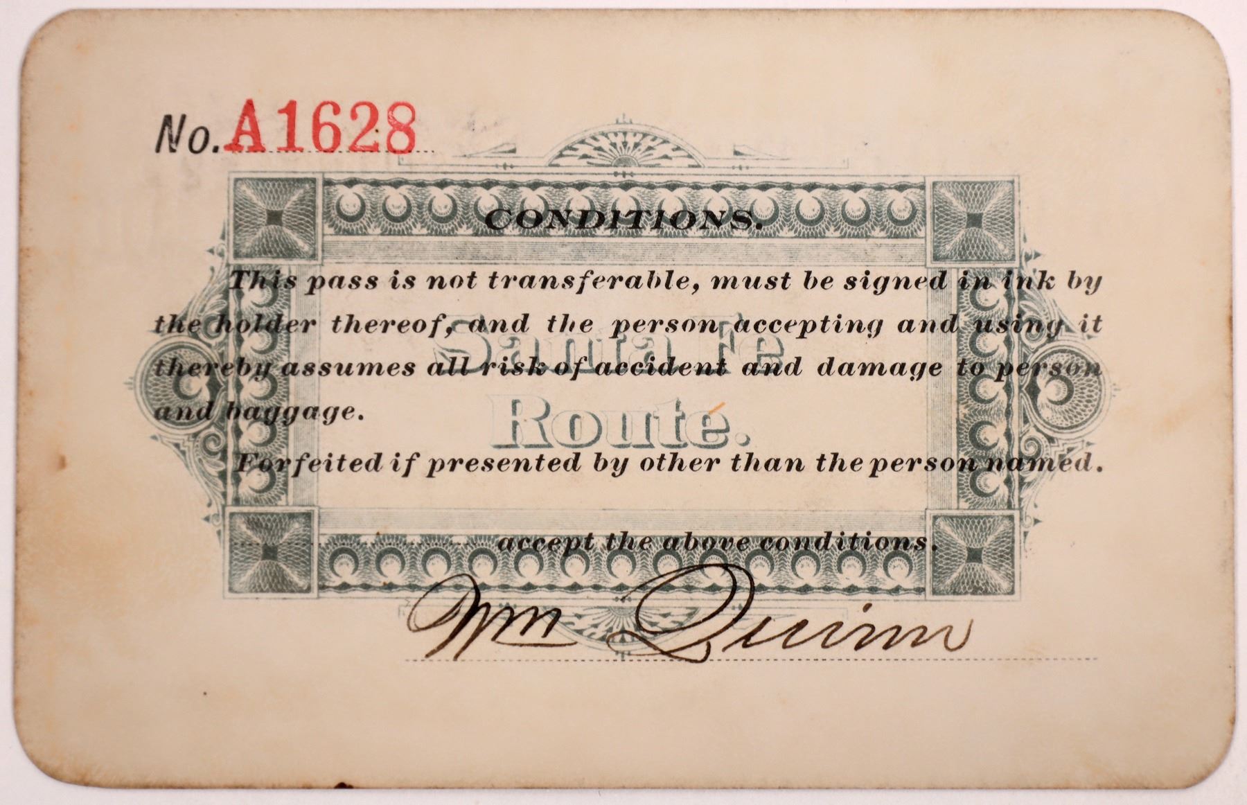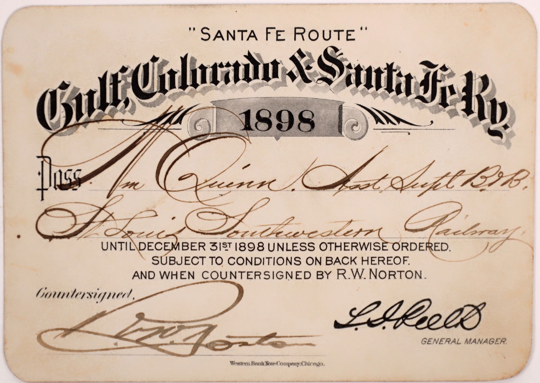 Santa Fe Route Pass issued to Wm. Quinn, superintendent of the St. Louis Southwestern Railway. The Gulf, Colorado and Santa Fe Railway was a subsidiary of the Atchison, Topeka & Santa Fe Railway. From its starting point in Galveston, Texas, the railroad eventually extended northwestwards across the state to Sweetwater and northwards via Fort Worth to Purcell, Oklahoma. State: City: Date:1898 Provenance: