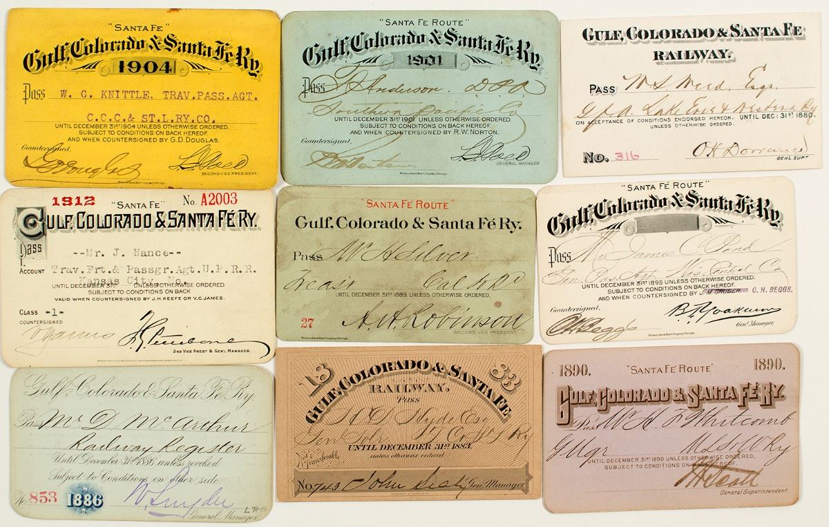 Lot of 9 different passes issued 1880-1912. Years included: 1880, 1883 (signed by John Sealy), 1886, 1889, 1890, 1895, 1901, 1904, and 1912. All printed on cardstock (varying colors). Chartered in 1873 by Galveston citizens who wanted to create a rail line that would cross Texas, bypass Houston and eventually reach Santa Fe, New Mexico. Ultimately, it went North. With a partnership with the Atchison, Topeka & Santa Fe, it connected to Purcell, Oklahoma. ATSF were trying to break Jay Gould's ever-growing control of the rail system in Northern Texas. ATSF eventually took over the line. (Prag Collection) City: State: Texas Date: Inventory# 41029