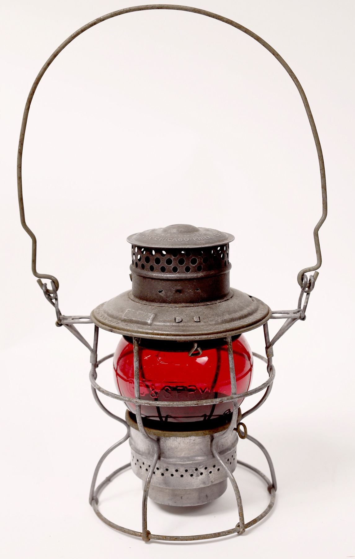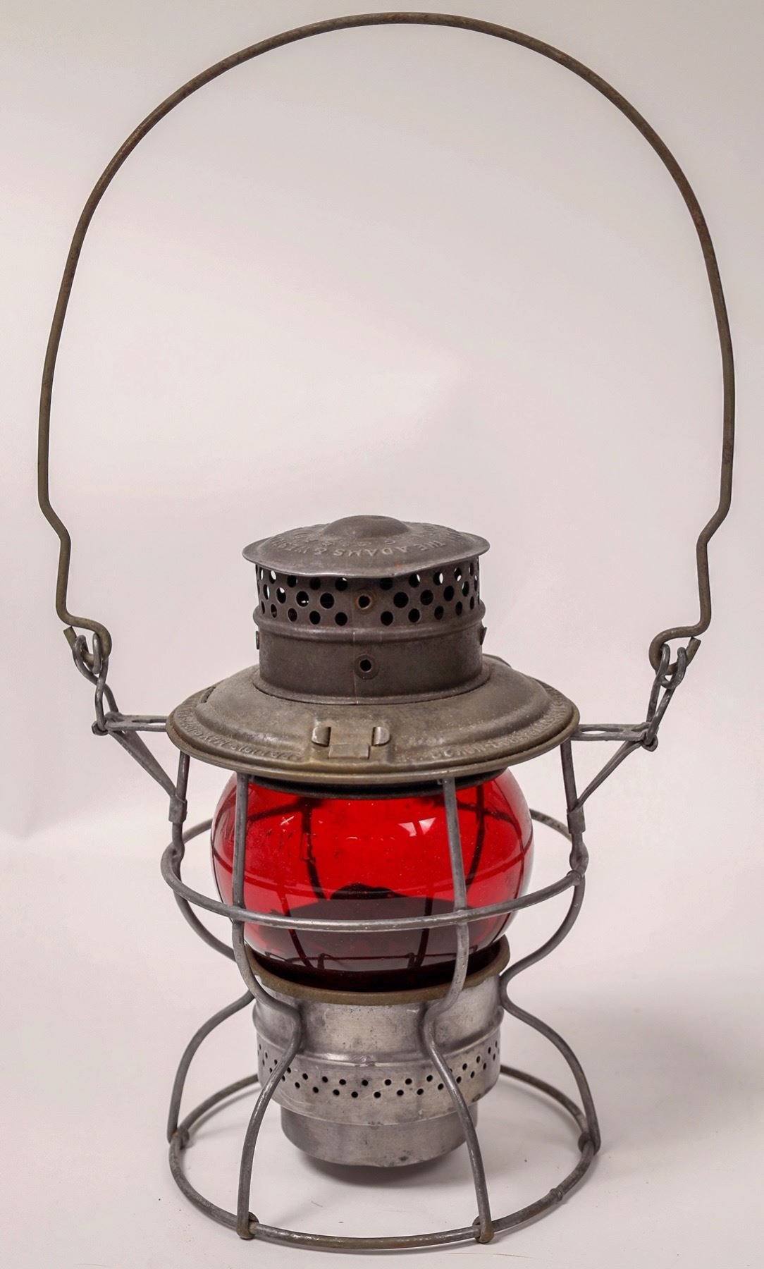 Last patent 1923. Embossed ruby red globe.9". Open wire basket. Small dent on top.