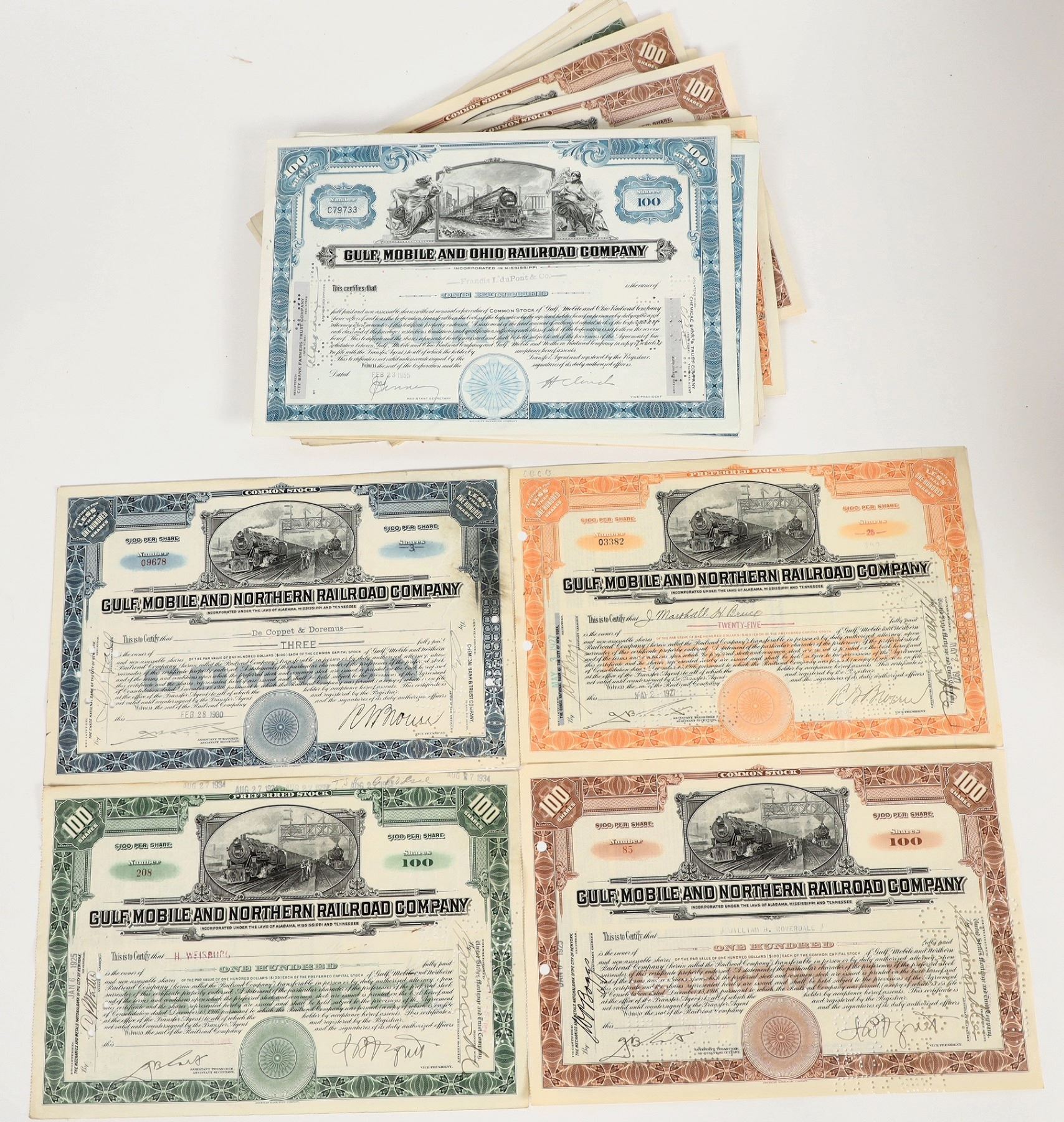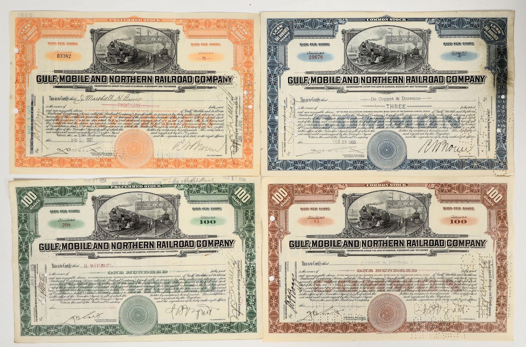 About 70 stock certificates from the Gulf, Mobile and Northern Railroad, about 60 from the 1920s-30s (orange); about ten from the 1950s (blue). Railroad vignettes.