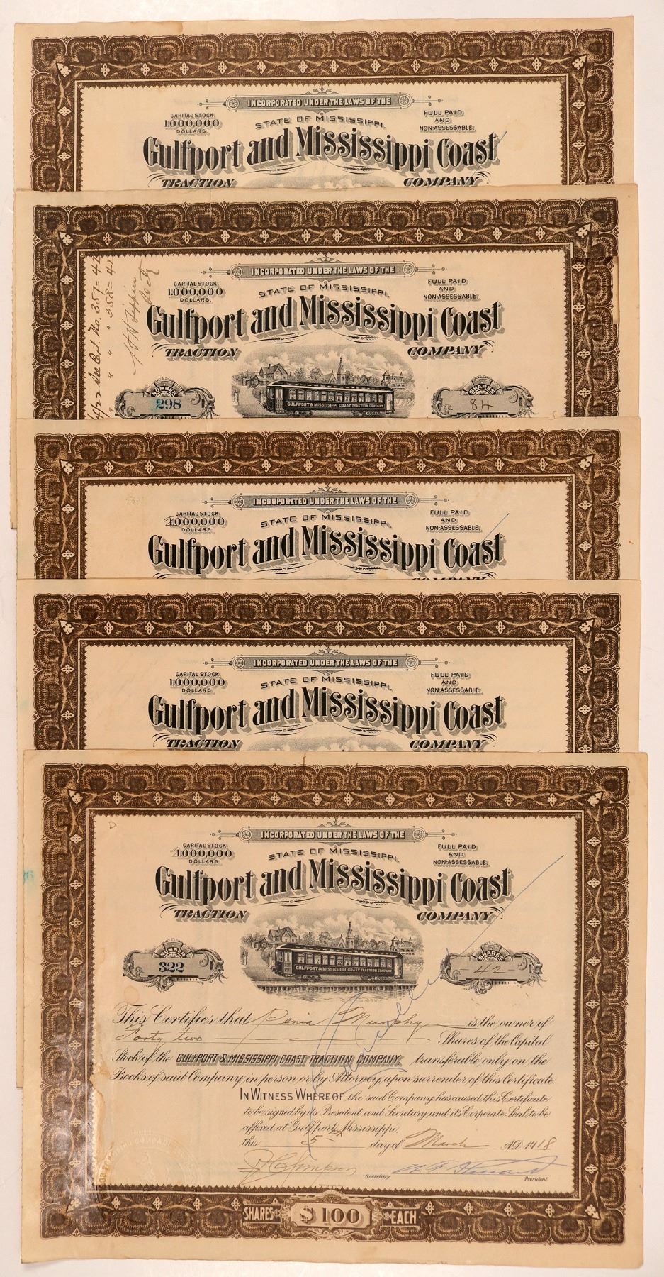 Lot of 5. Inc. in Mississippi. Issued 1914, 1918(x3), and 1920. Two punch cancelled. Brown border, black print, and streetcar vignette. Folds, creases, moderate wear. 9 x 11" In 1906, the Gulfport and Mississippi Coast Traction Company began operating trolleys in the Gulfport area. Replaced by buses. Ended in 1926. Ken Prag Collection