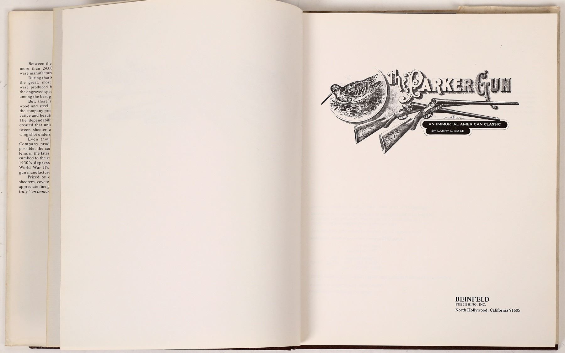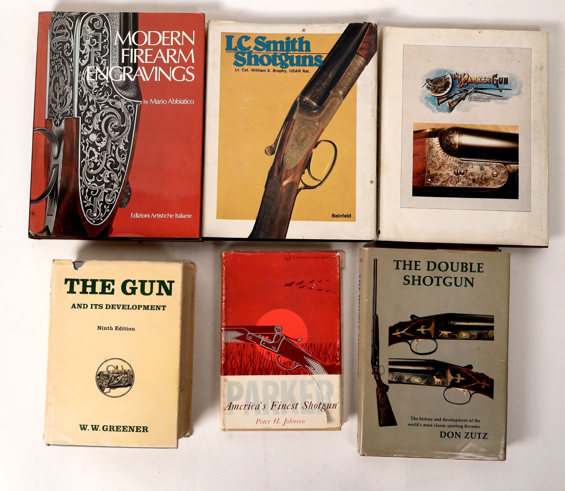 There are six books in this lot: "America's Finest Shotgun Parker" by Johnson, 1963. pp.259, hardcover with torn DJ, water damaged pages; "The Double Gun" by Zutz, hardcover with DJ, 1978, pp. 260; "The Parker Gun" by Baer 1980, hardcover, water damaged DJ, pp. 196; "L.C. Smith Shotguns" by Beinfeld 1978, hardcover with torn DJ, pp. 240; "The Gun and its Development" by W.W. Greener ninth edition, hardcover with torn DJ, pp.782; "Modern Firearms Engravings" by Mario Abbiatico hardcover, 1980 pp. 278 .