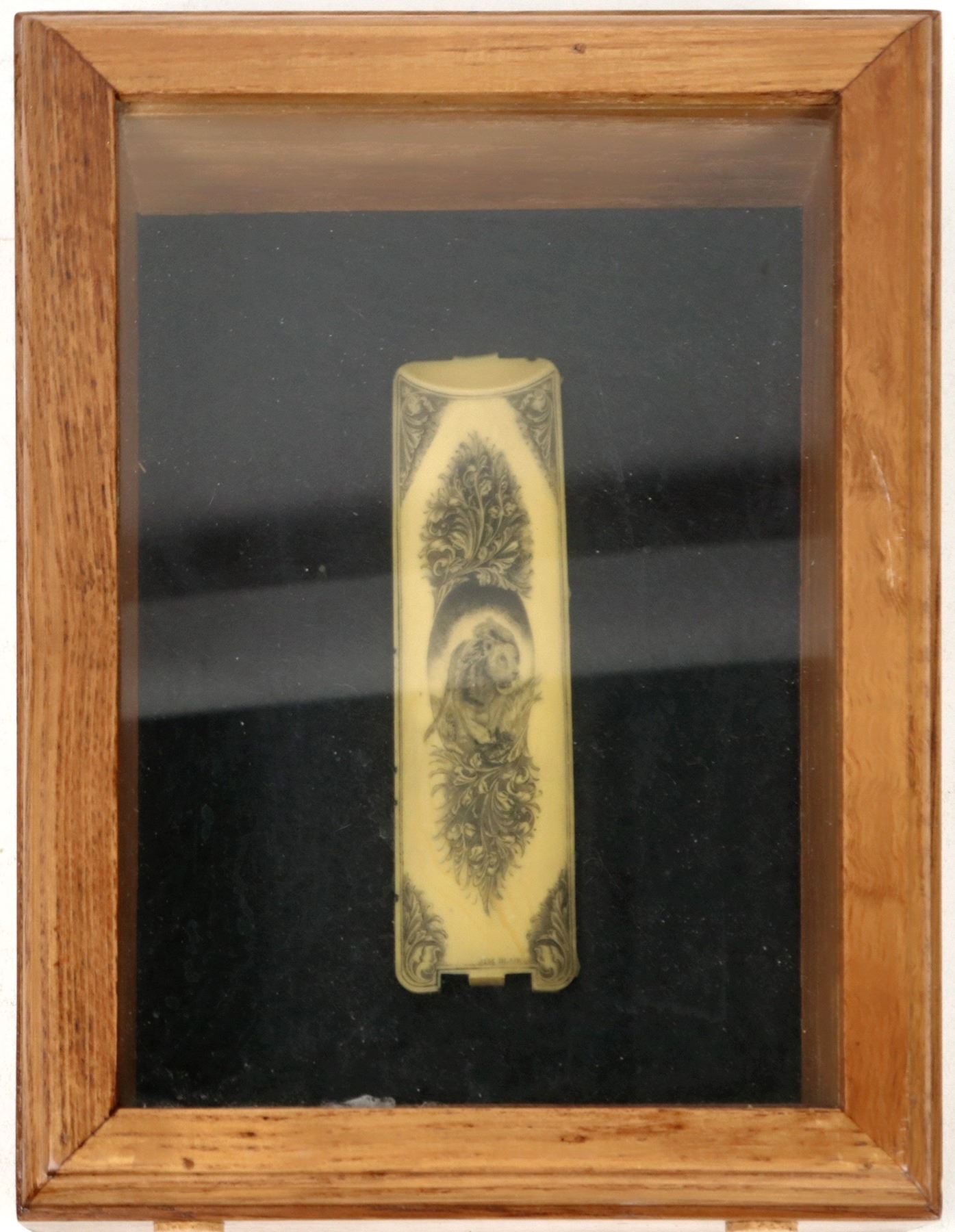 This gun engraving is of a bolt action rifle floor-plate with a lioness as the center. FEGA engraver Jim Blair used bulini and banknote style to complete this piece; signed at the bottom edge. The lioness is a popular subject among African game animals. The lioness is known to attack humans by a coordinated ambush from front and flank before you realize that you are the target. (As told by Tweed Roosevelt great grandson of Theodore). Please see photo for details.