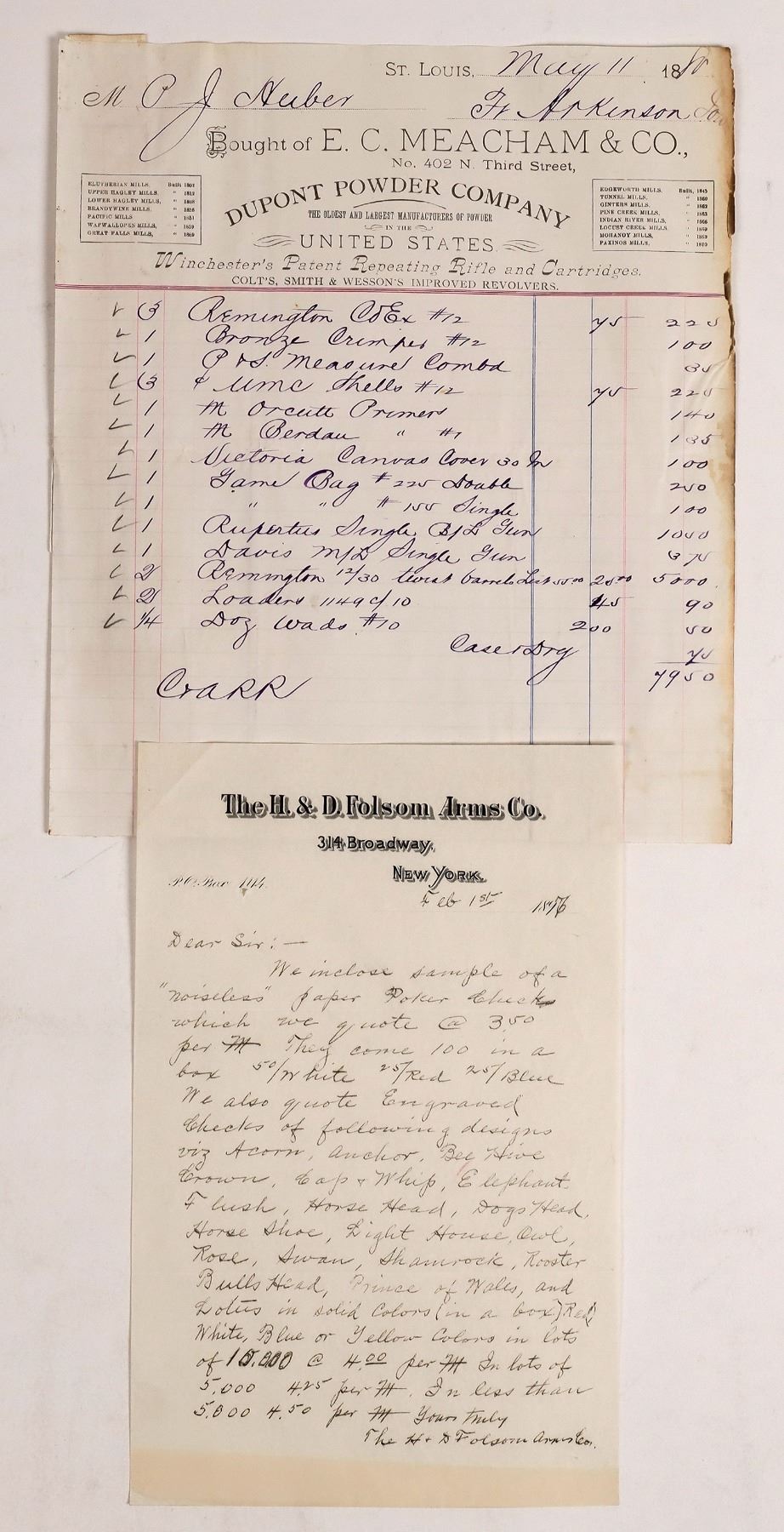 1897 letterhead, H & D Folsom Arms Co. about enclosing a sample of a noiseless paper poker cluck?, we are unsure of what this means. 1880 EC Meacham letterhead with purchase of 2 Remington's and related goods.