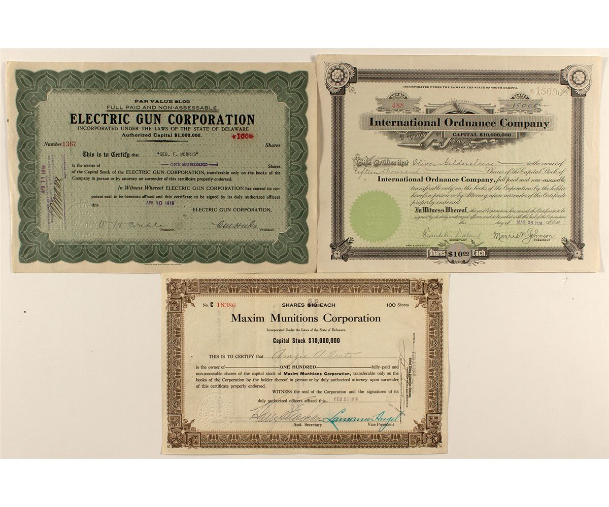 Lot of 3. 1) Electric Gun Corp, stock no. 1367 issued to Geo. Morris for 100 shares on April 10, 1918. Cancelled. 2) Maxim Munitions Corp., stock no. C 18386 issued to Amzie Feets on February 21, 1918 for 100 shares. Uncancelled. 3) International Ordance Co. Stock no. 488 issued Oliver Gildersleeve for 15,000 shares on March 28, 1910. Cancelled.City: County: State: Date: 1910-1918