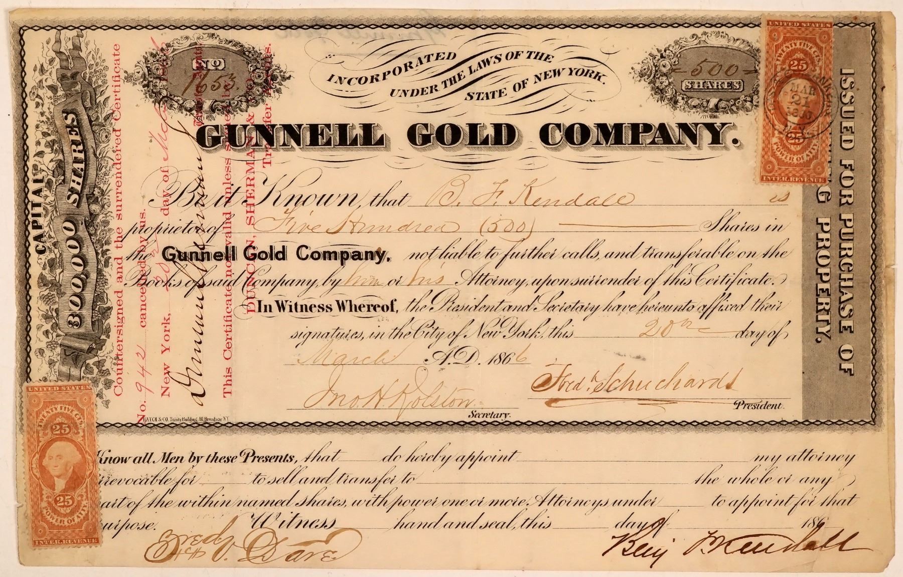 Inc. in New York. No. 1653, issued for 500 shares to BF Kendall on March 20th, 1866. Signed by the president Fred. Schuchard(?) and secretary Jno. Kolston. Not cancelled. Black border and print. Unusual that it has two 25 cent adhesive revenue stamps attached. Pinholes, folds, creases, other light wear. 6.5 x 10.25" According to Hollister (1867), the company owned 450 feet on the Gunnell Lode, incl. No. 1 east of Discovery. The main shaft is 438 ft. deep. The mine has yielded 500 ounces of gold per month for the past year. They have an 18-stamp mill in Nevada Gulch and lease the New York Company's mill in Black Hawk (pg. 161-162).