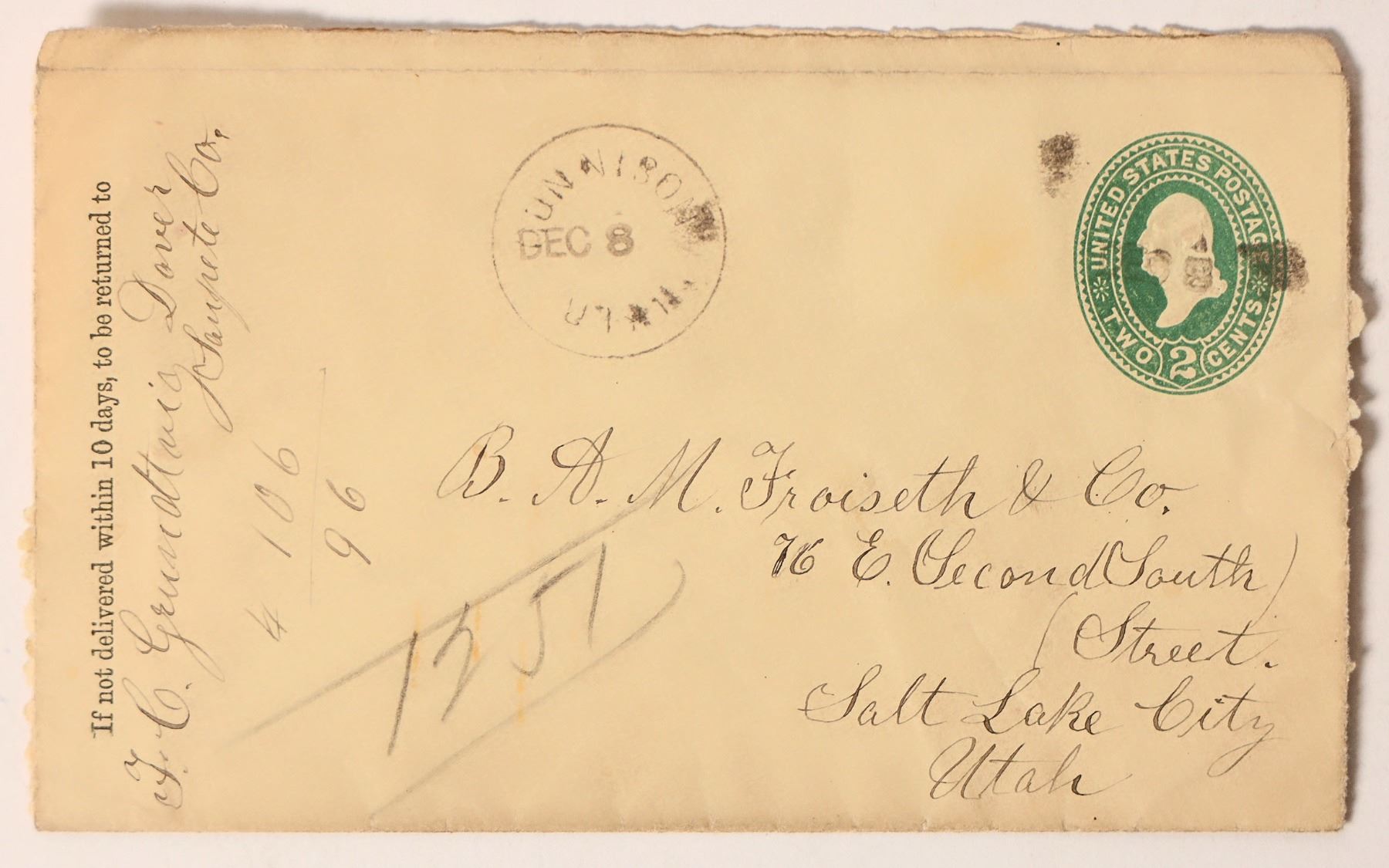 Cover with a Gunnison, Utah, cancel, appears to be dated 1898. Pre-paid U.S. postage for 2 cents. To Salt Lake City from Colorado. Torn open on sides and top.
