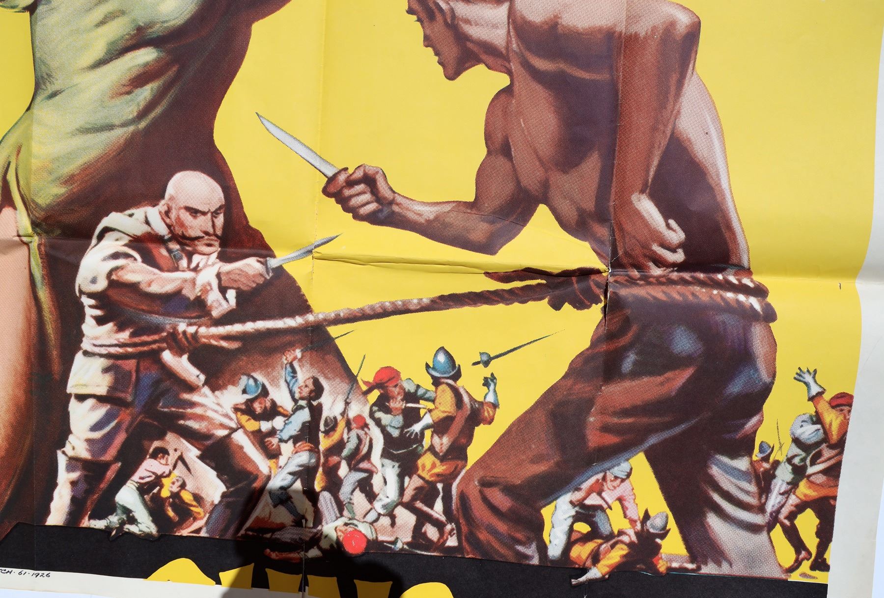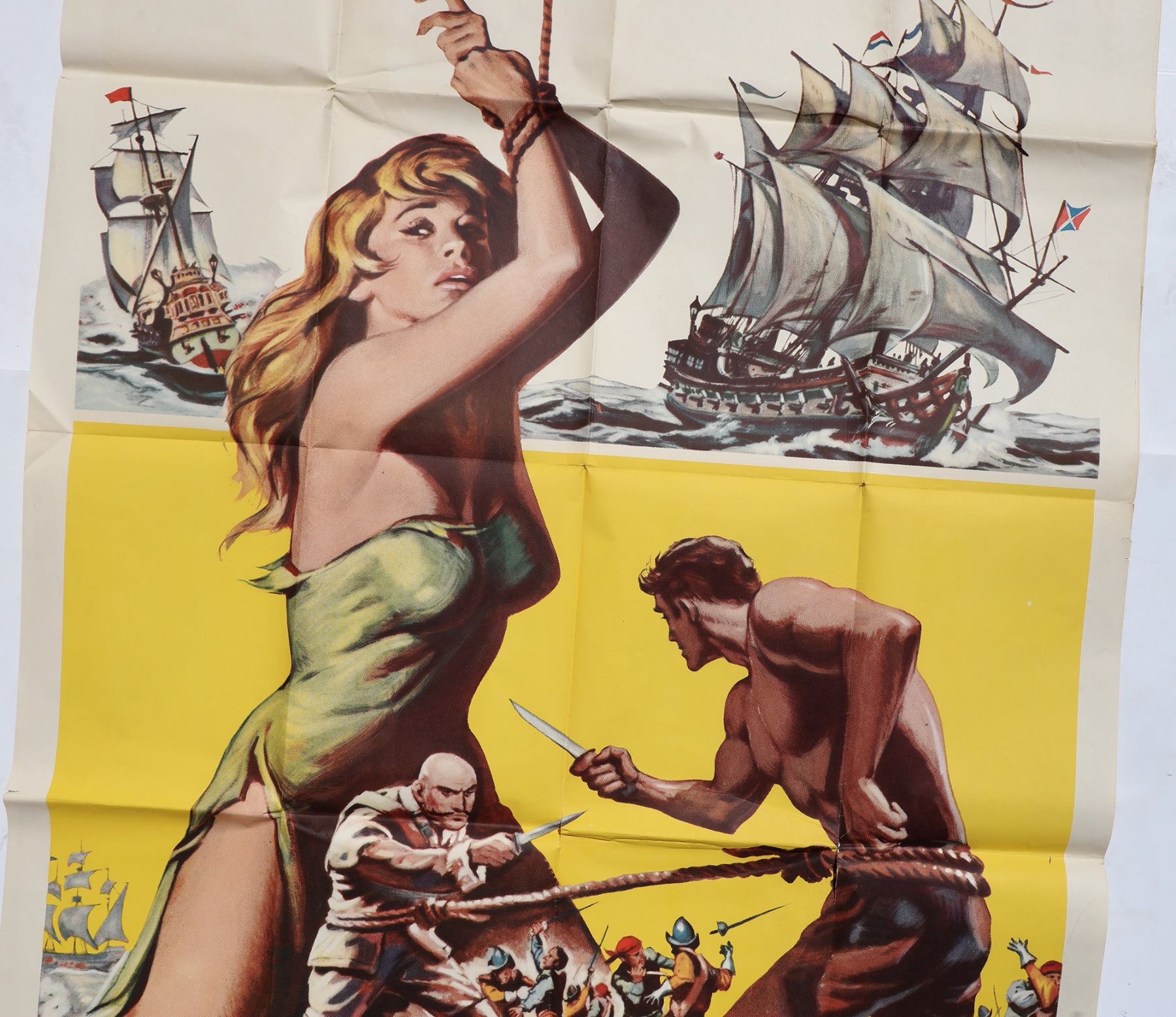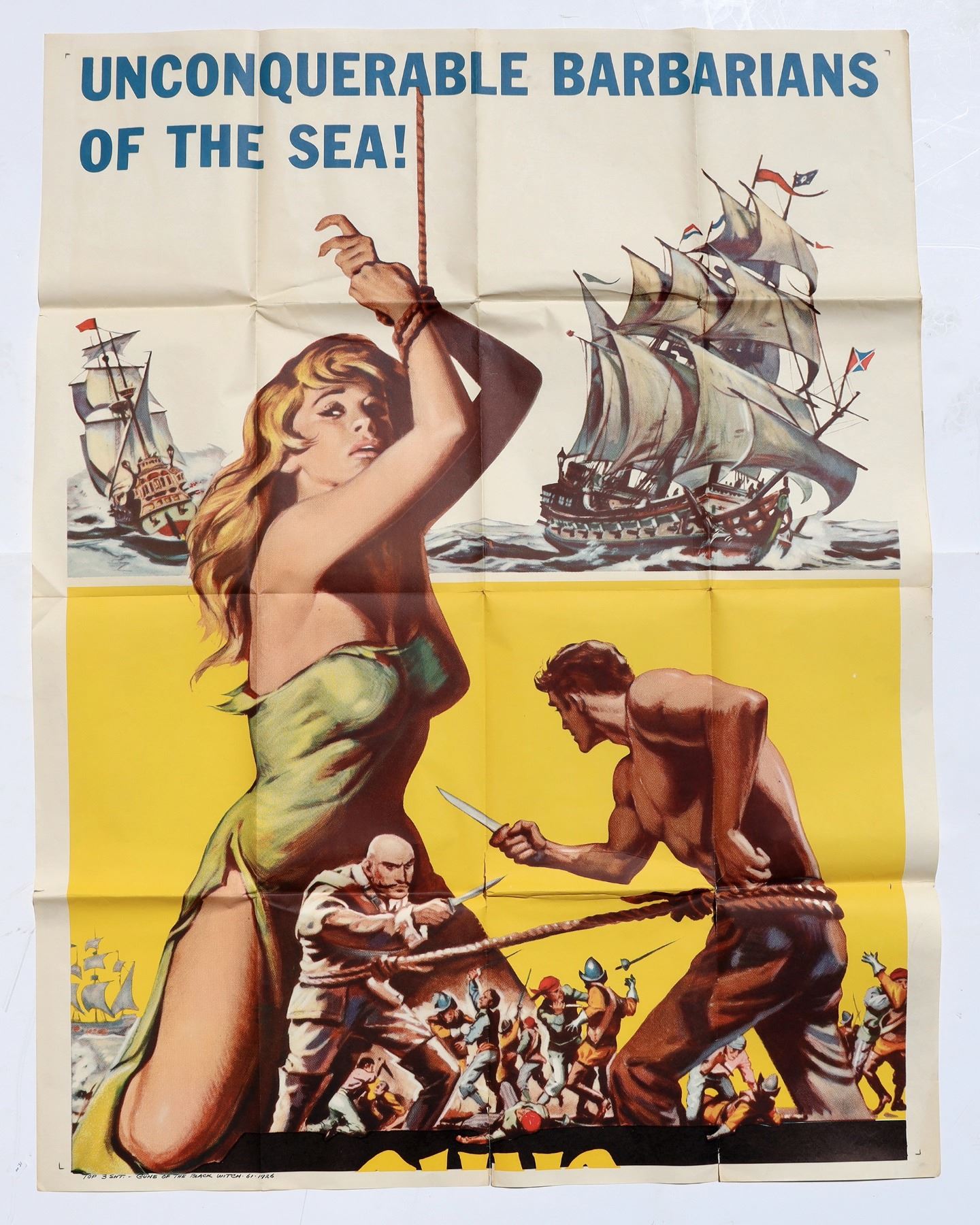 A sheet for the Italian made swashbuckler film "Guns of the Black Witch" with the catch line "The Unconquerable Barbarians of the Sea." This film was released in 1961 to tepid response. It appears the Italians were better at westerns. A rare piece of cinema art. It has some crease tears which can easily be repaired. Please see photos for more details.