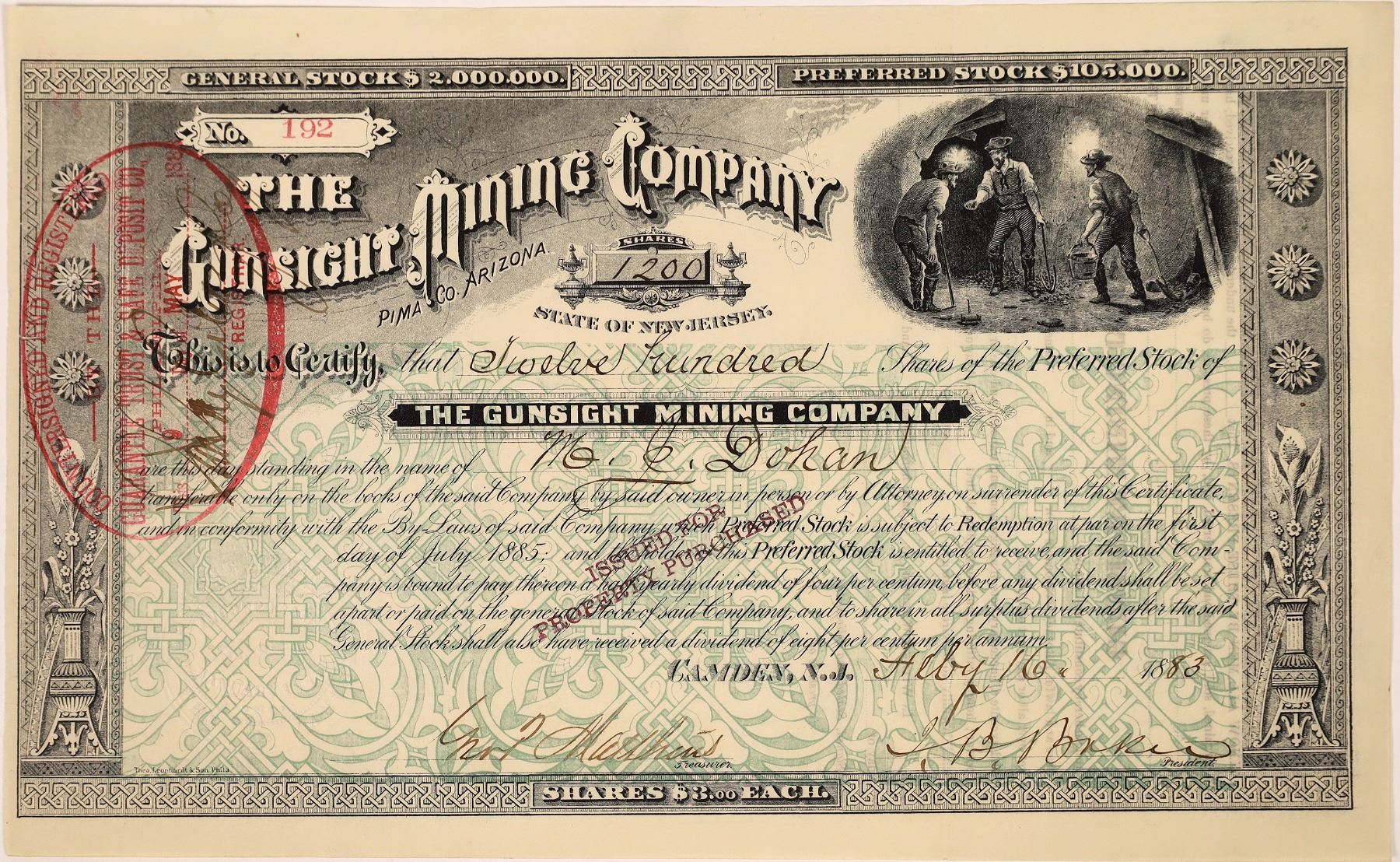 Pima Co., Arizona (printed under title). Inc. in New Jersey. No. 192, issued for 1,200 shares to M.J. Dohan on Feb. 16th, 1883 in Camden. Signed by president Baker and treasurer Matthews. Not cancelled. Very ornate black border and print with green underprint design. Fancy logo and vignette of miners with headlamps. Folds, one spindle hole on the left side. Very nice. 7 x 11" This mine was located at the north end of the Ajo Mountains. The district was protected the the 1860's, but it wasn't until this mine began operations that the district actually produced. The Gunsight was the major producer when high-grade silver ore was discovered. The story is told that the Gunsight Mine was discovered by prospectors in November 1878 and so-named because the nearby mountain looked like a gunsight. Soon the miners came for the rich silver ore and Gunsight camp was established. The Post Office was established in 1892, and at that time the mine was producing under the aegis of the Silver Gert Mining Company. There were 8 buildings at the site and 40 employees. The vein was over 4 feet wide, reached by a 340 foot shaft. It was the richest mine in the district. By 1896 the Post Office closed. [Ref: Mines Register, 1922]. [Garbani]