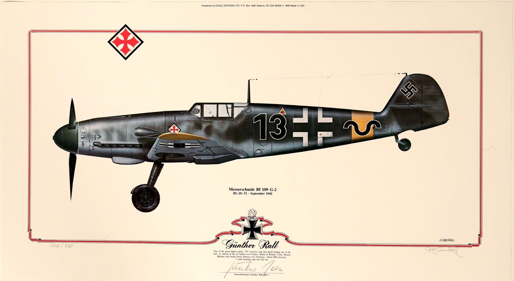 Print by Jerry Crandall unmounted and in excellent condition. #438/950 signed by the artist and the pilot. Günther Rall achieved a total of 275 victories making him currently the highest ranked living ace of all time, after the death of Luftwaffe pilot Erich Hartmann.