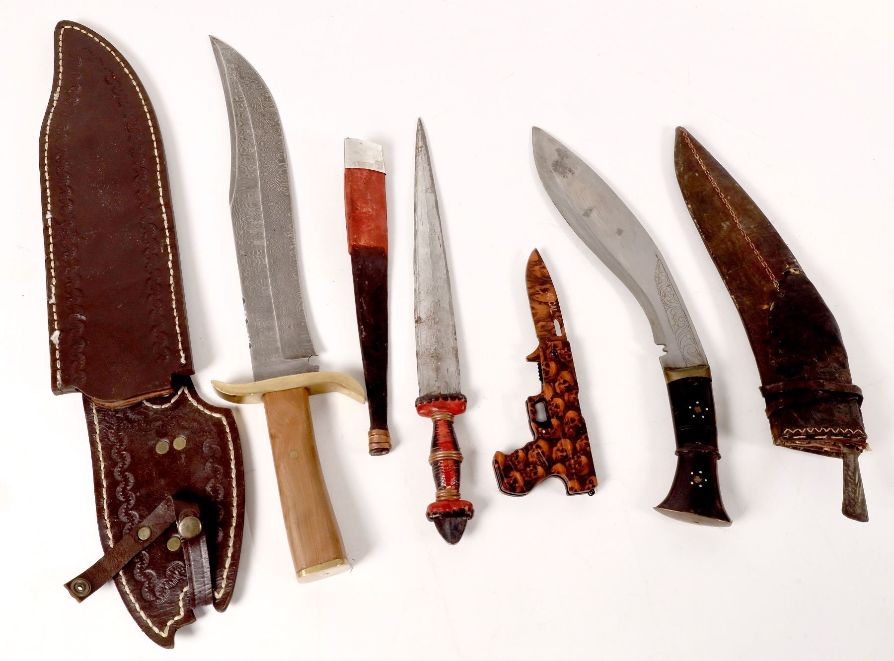 This lot has a Gurkha knife with sheath at 14.5 in. and a 10 in. blade. It has light engraving need the guard both sides, and horn grips. Country of origin may be Nepal, Pakistan, or India. There is also a very large Bowie knife at 18.5 in. with a 13 in. clip point Damascus blade. It has heavy brass guard , a wave pattern Damascus scene, blade hook at the guard, with a heavy leather sheath. Like new condition; likely made in Pakistan. A homemade dagger at 14 in. with leather sheath. And a assisted open knife in the shape of a semi-automatic pistol 4.5 in. close and 8 in. open maker unknown. Like new condition. Please see photo for details.