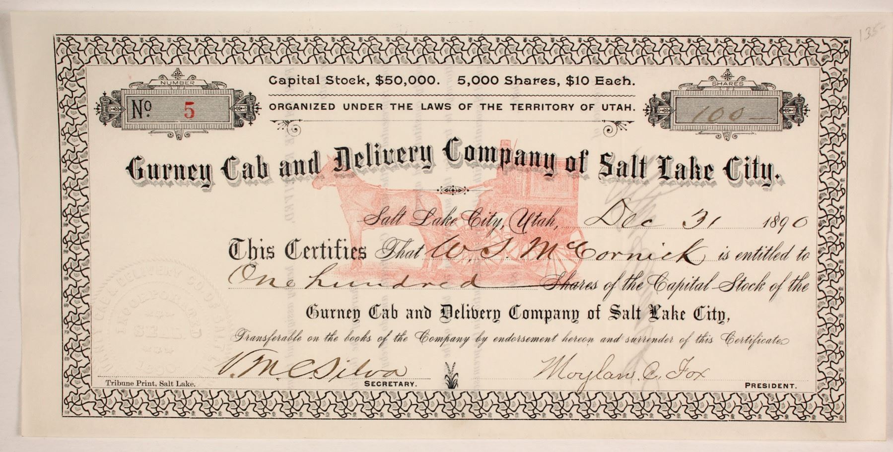 Fabulous certificate. Underprint horse drawn wagon. Stockholder WS McCormick, Utah banker and mining investor. Early number 5 for 100 shares. Organized under the laws of the Territory of Utah. Signed by VM Silva and Moylan C Fox. Printer Tribue Print. Dateline Salt Lake City December 31, 1890. Pristine condition! State: Utah City: Salt Lake City Date: 1890