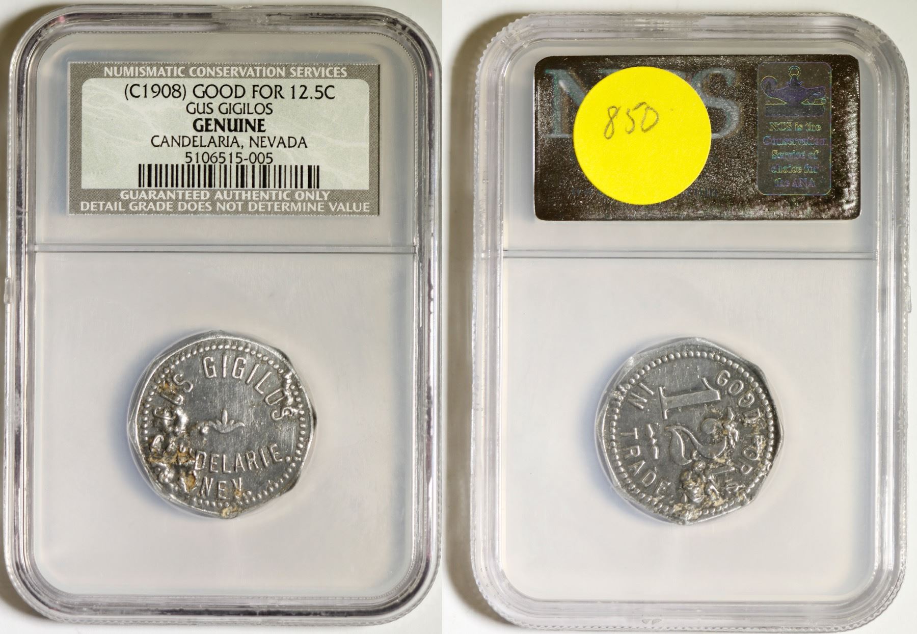 Lobv.: Gus Gigilos / Candelarie, / Nev.; Rev.: Good For / 12 1/2c / In Trade. Al., octagonal, 24 mm. NCS certified genuine. Candelaria misspelled on the token. State: Nevada City: Candelaria Date: HWAC# 84313