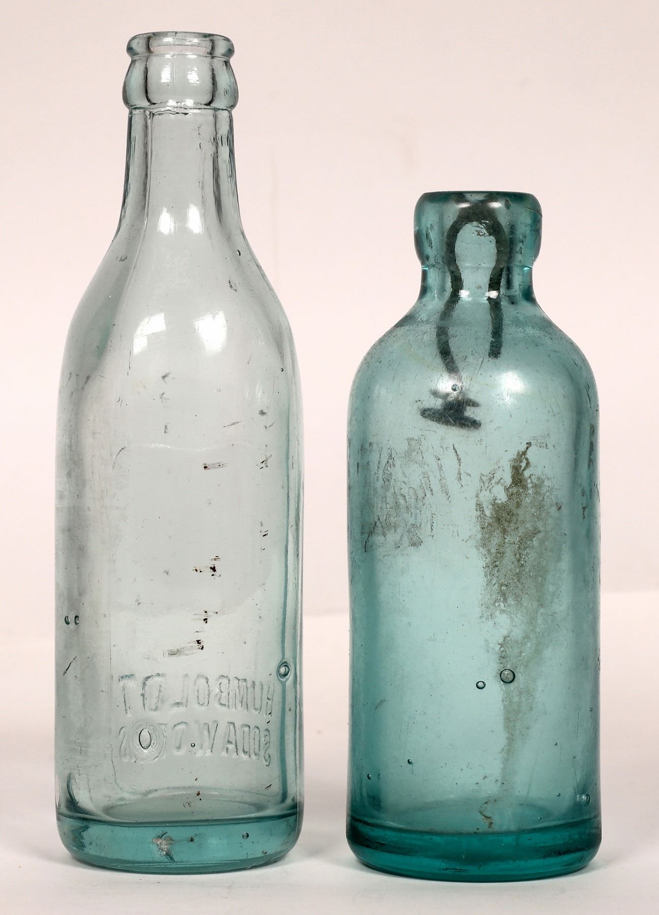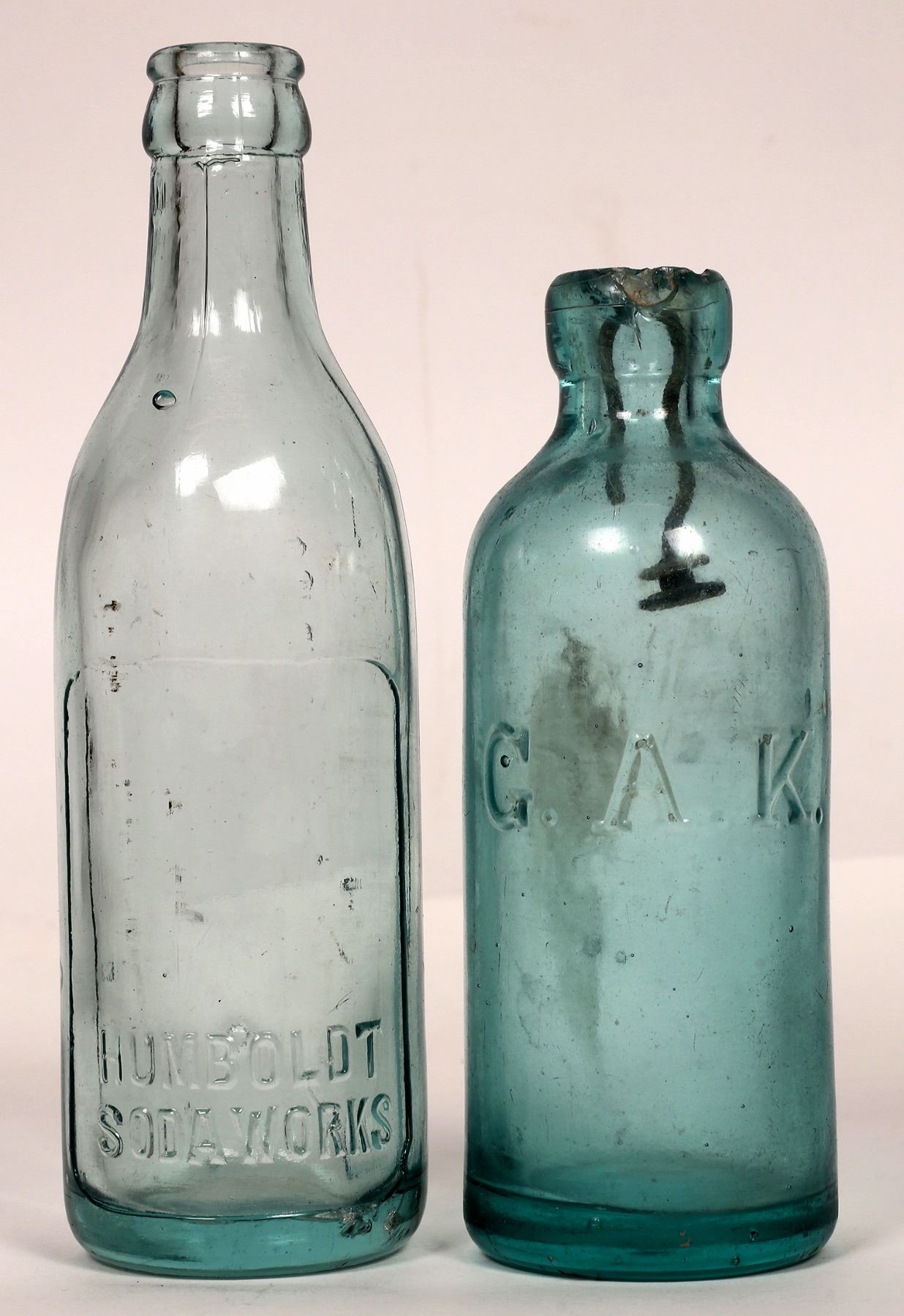 Light aqua crown top Humboldt /Soda Works, 7.75" with base chip and ding. Aqua G A K applied top with 2 large lip chips. Please inspect. [Nevada] [Fred Holabird Collection]