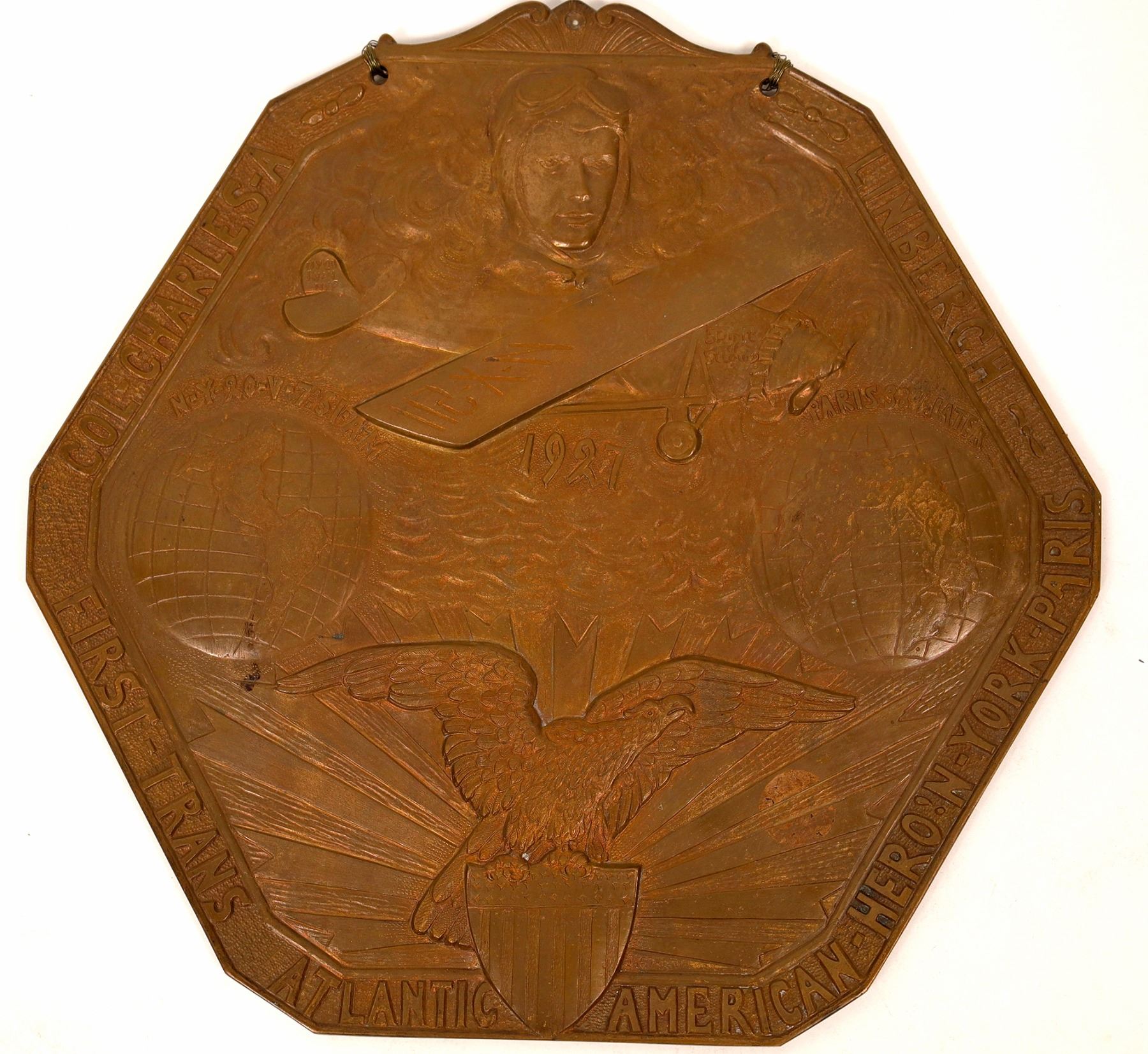 Spectacular and magnificent large bronze medallic plaque celebrating Lindbergh's famous first flight across the Atlantic in 1927. Made by sculptor and painter Julius T. Gutzwa of Meridian, Connecticut. Gutzwa (c1891-1956) was a Polish immigrant who came to the US at the age of 15. His artistic talents soon came to the forefront, and he became known as a painter and sculptor. His most famous work was a large bronze statue of Polish General and Patriot Pulaski, completed in 1934. His murals are found in Hartford, Meridian and elsewhere in Ct. In 1933, Gutzwa was commissioned to paint a number of present and historical world figures, including Woodrow Wilson and George Washington. Even though Gutzwa was an exceptionally successful and well paid artist, his name does not appear among the many standard art reference works. Noted medallic historian Dick Johnson. long time curator of the Medallic Arts Co., noted one known Lindbergh (note 2 different spellings) bronze plaque, which does not appear to be this piece. Johnson assigned a construction date of 1932, though we found no records on the web. Thus at present, there are two of these magnificent plaques known. 9 7/8" octagonal, two holes in upper panel for suspension. A third hole was considered and partially drilled at top center. This is an exceptional piece in XF-AU condition.