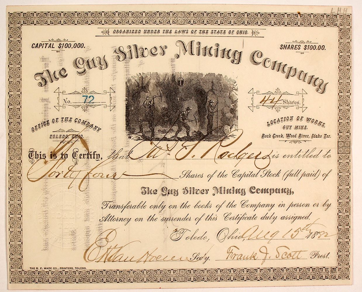 Issued 1882 Idaho Territory to Rodgers #72 44 shares. Location stated on certificate: Guy Mine, Rock Creek, Wood River, Idaho Ter. Nice underground mining vignette. Signed by Frank J. Scott as president and the company secretary. Not cancelled. Date: Location: Idaho HWAC# 56154