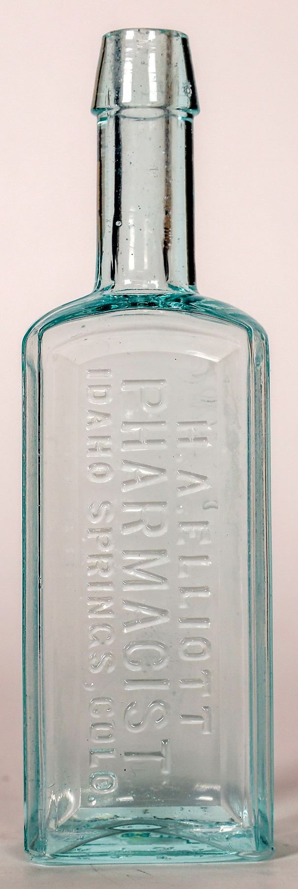 Unlisted in Preble light aqua sunken panel H A Elliot/Pharmacist/Idaho Springs, Colo. 5.75". No apparent chips or cracks. Reed Collection.