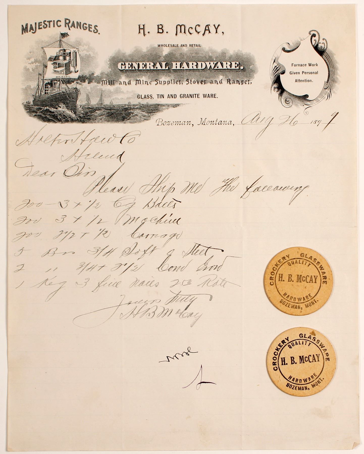 Lot of 3. 1) Gorgeous illustrated letterhead for H.B. McCay, General Hardware, Mill and Mine Supplies, Stoves and Ranges. Dateline Bozeman, Montana, Aug. 26th, 1899. Addressed to a merchant in Helena requesting various supplies. 2) Also comes with two silver-dollar-sized circular business cards. Nice trio!