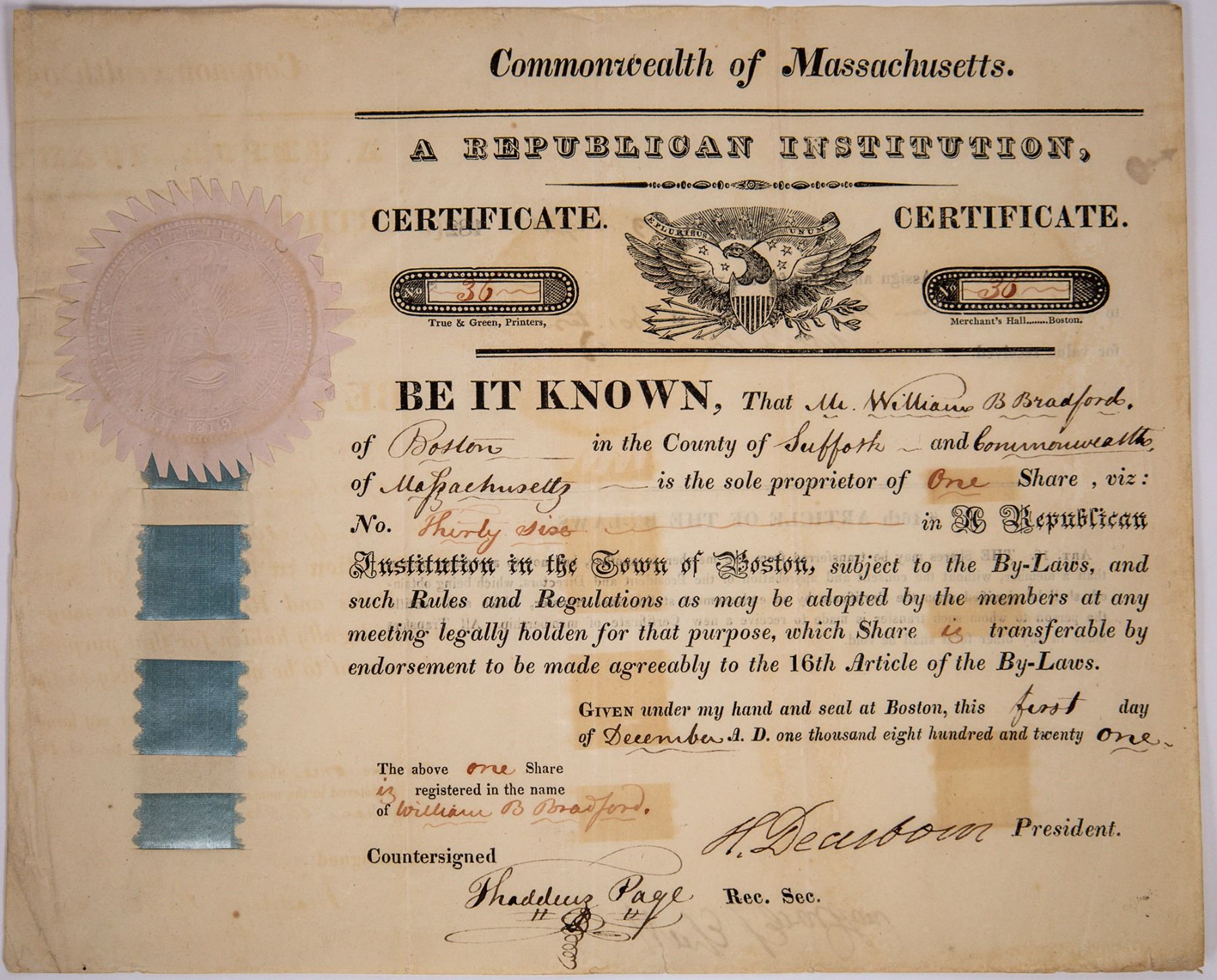 I/UC. Henry Dearborn served under Benedict Arnold in the Revolutionary War, and was later on Washington's staff. He was Secretary of war under Jefferson. Many places are named after him including Dearborn Mic. Issued to William B Bradford of Boston for 30 shares. Dearborn was president of this company.