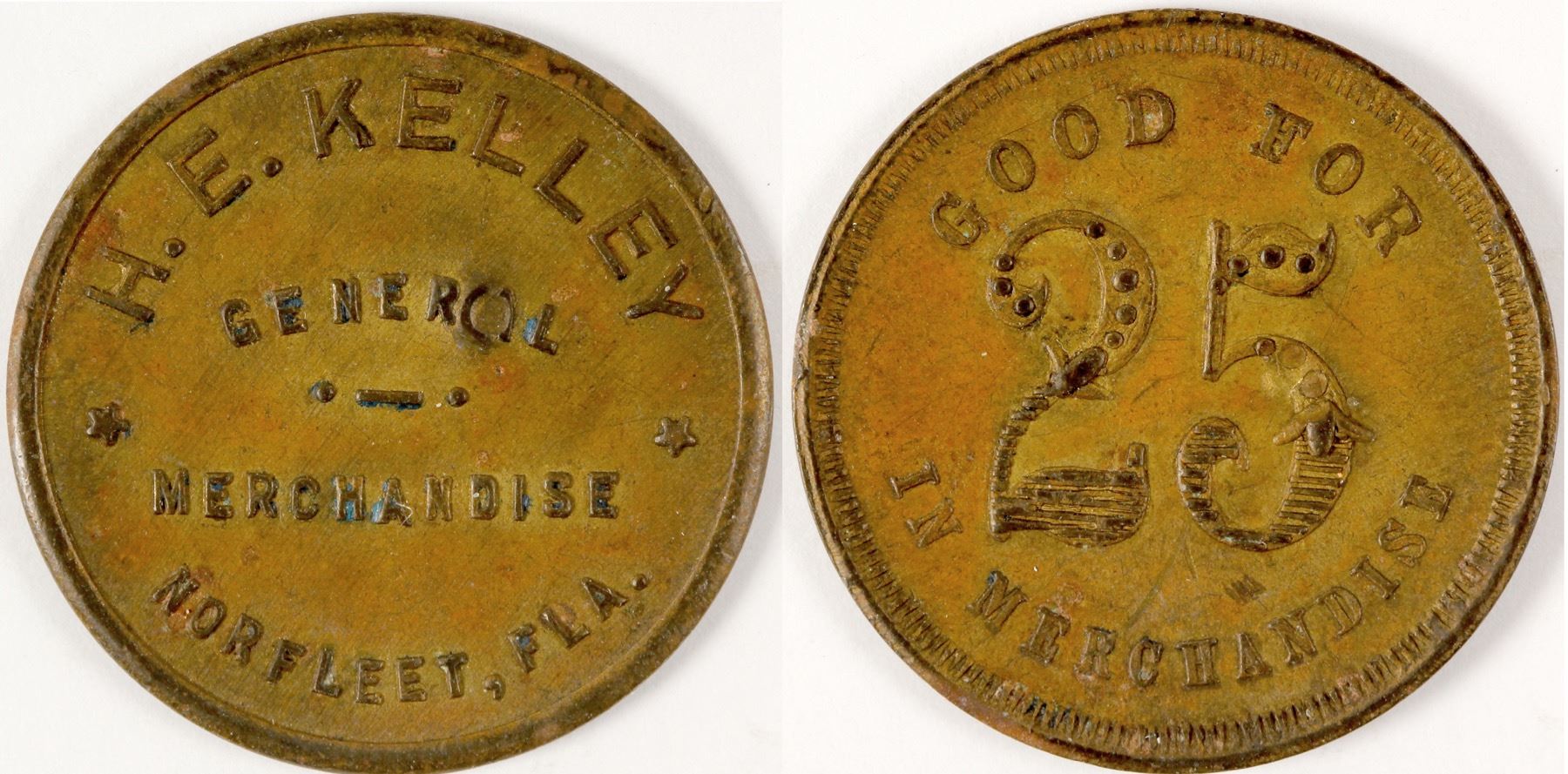 Obv.: H. E. Kelley / General / Merchandise / Norfleet, Fla.; Rev.: Good For / 25 / In Merchandise. Br., rd., 27 mm. From the W.P. Jones Sr. Collection. State: Florida City: Norfleet Al Adams Collection. HWAC# 57763