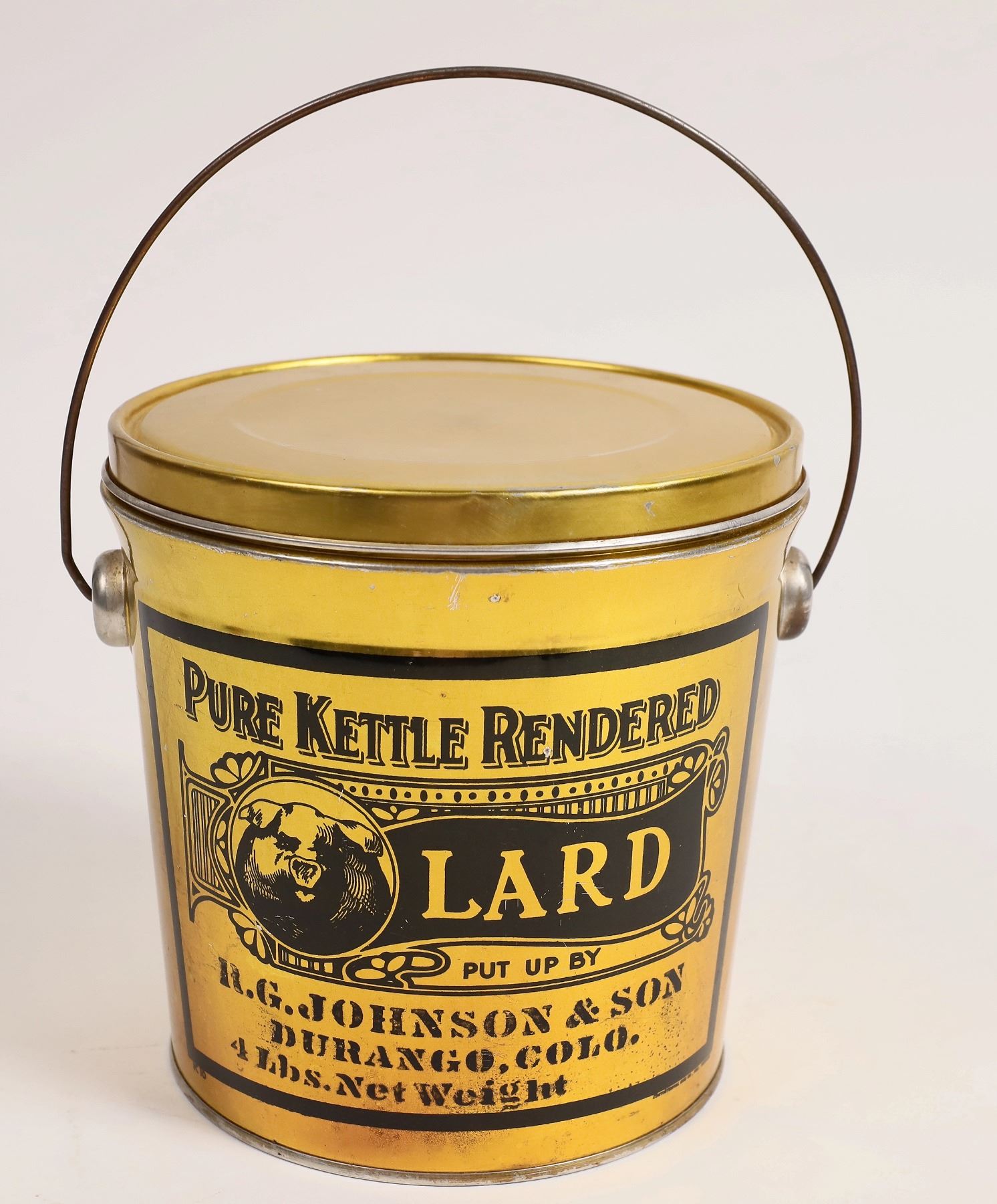 Mint condition H. G. Johnson & Son, Durango, Colo small lard tin. 6.25x6.25" plus handle. Nice tin!