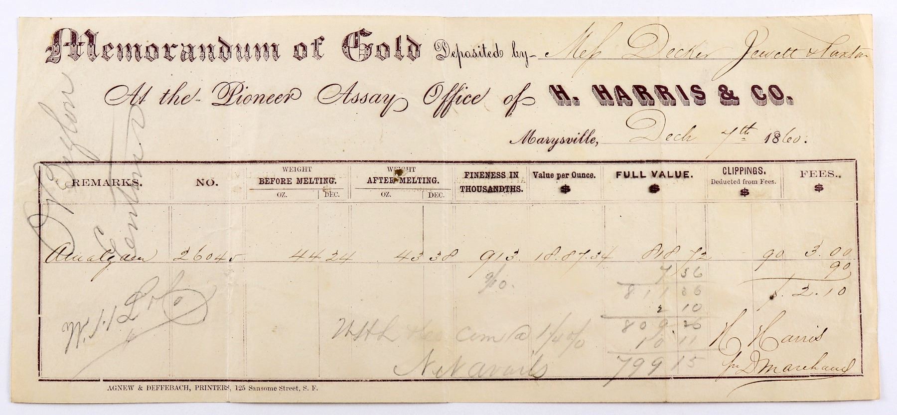 H. Harris & Co. Pioneer Assay Office, (Late Harris & Marchand), Marysville, CA, October 27, 1859 - No. 19609 Memorandum of Gold Deposited by Bankers Cadwallader Co. This receipt was printed on creme or buff colored paper in a reddish-brown ink by Agnew & Deffenback, Printers, 125 Sansome Street, S.F. Amalgam weighing 53.25 oz was deposited, after melting it weighed just 52.59 oz., which indicates that a combination of nearly three quarters ounce of mercury and slag were removed during the melt. The gold had a fineness of .951 with a value per ounce calculated to be $19.65.89. The full value the assayed deposit is written as $1,031.89 before any deductions for clippings and other charges leaving a net of $1,061.65. A commission of 2% for coining and $2.52 and $3.00 for misc. and assaying fees were charged The rarity of H. Harris & Co. assay receipts also showing the names of Harris & Marchand rates as Extremely Rare with perhaps only three or four known such as this one. This receipt was signed by H. Harris for D. Marchand. It has the usual ìpocket folds common to virtually all assay receipts, the overall condition is deemed to be Very Fine. The names of Harris and Marchand are well known to ingot collectors because of the beautiful gold ingots they rendered in their assay offices, some of which were recovered from the wreck site of the S.S. Central America, which sank while loaded to the gunnels with gold coins and assayers ingots off the east coast of the United States during a hurricane in 1857. Very Fine, R8. Possibly the earliest known. Size: 10.25 x 4.625 inches. Check the Mining Section for other RARE California Assay Office documents. Marysville California 1859