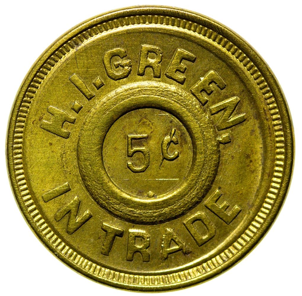 R-9. H. I. Green / 5c / IT // blank. Round, brass, 23mm. (Svoboda Collection) City: Giltedge State: Montana Date: HWAC# 35328