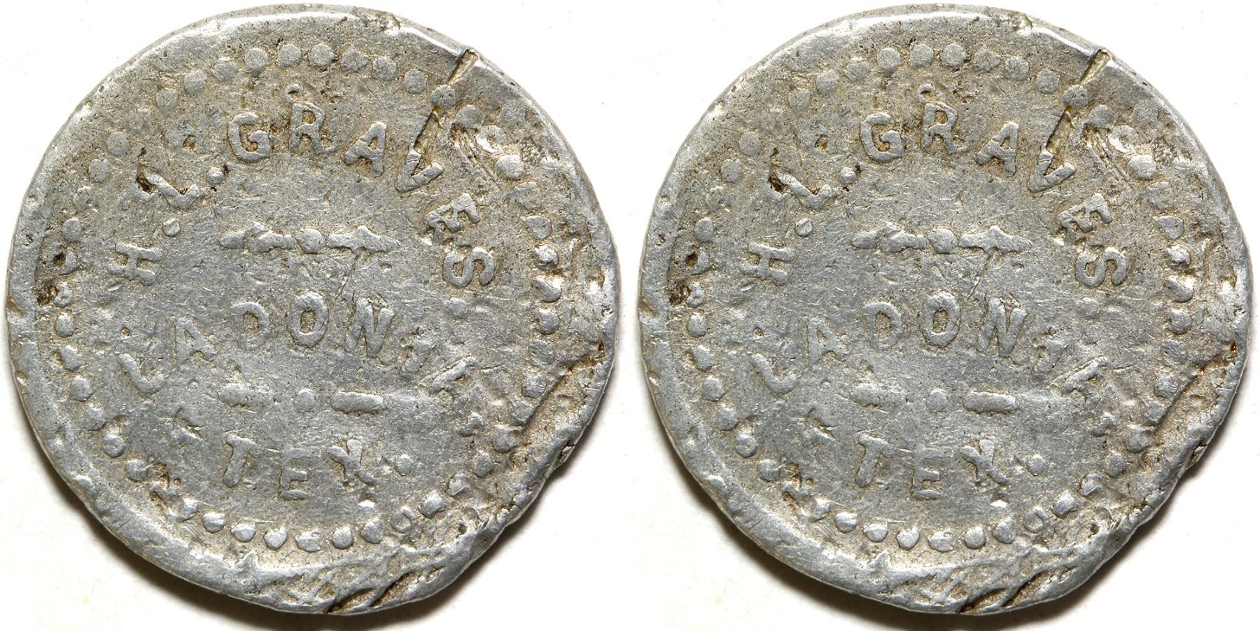 Round aluminum 20mm, H.L. GRAVES/LADONIA TEX//GF 5C IM. A tough Texas town. HWAC# 62515 Date: Location: Ladonia, Texas