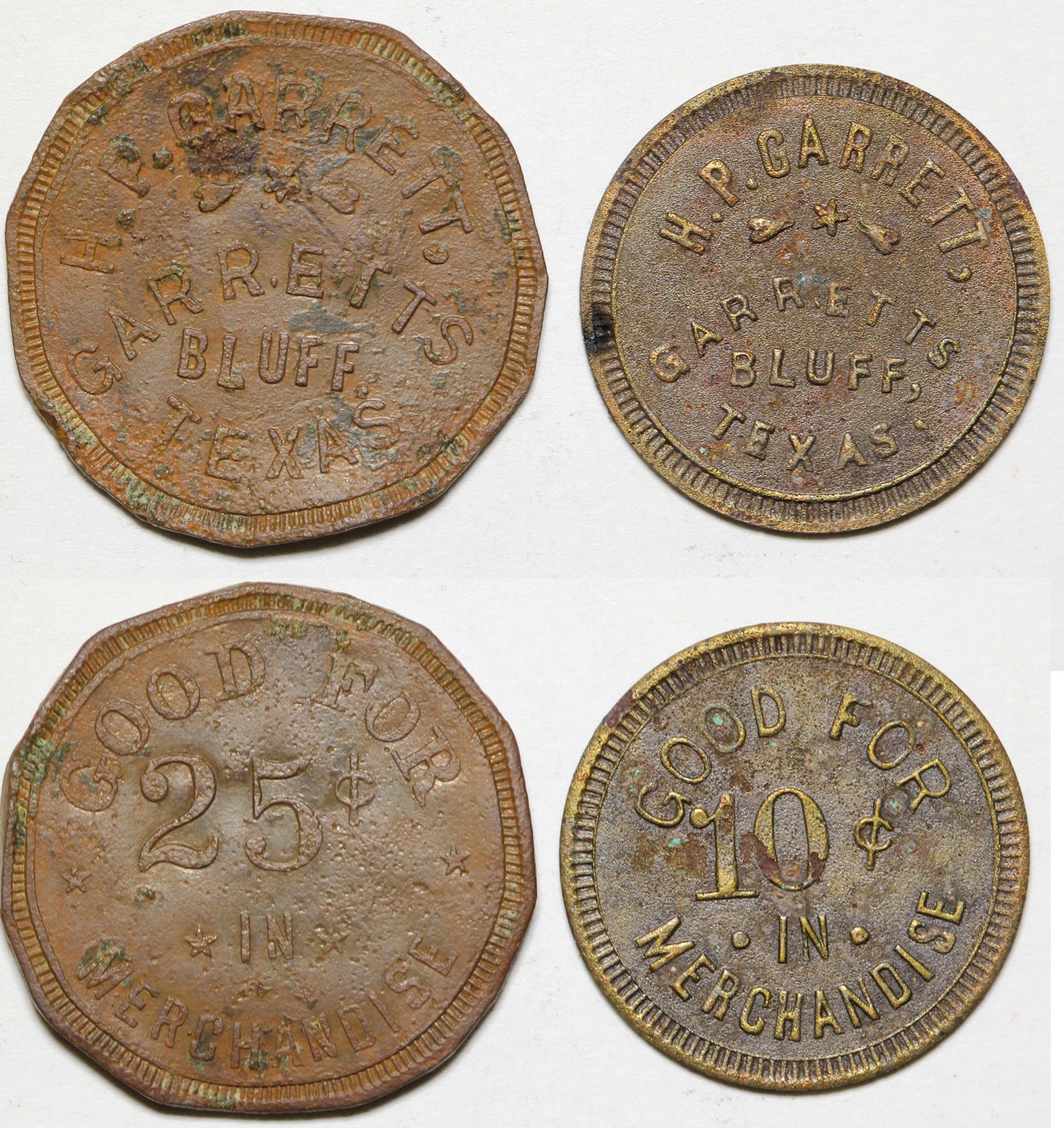 Two Good for tokens, 10c & 25c . Just a wide spot in the road near Lamar State: Texas City: Garretts Bluff Date: HWAC# 85377