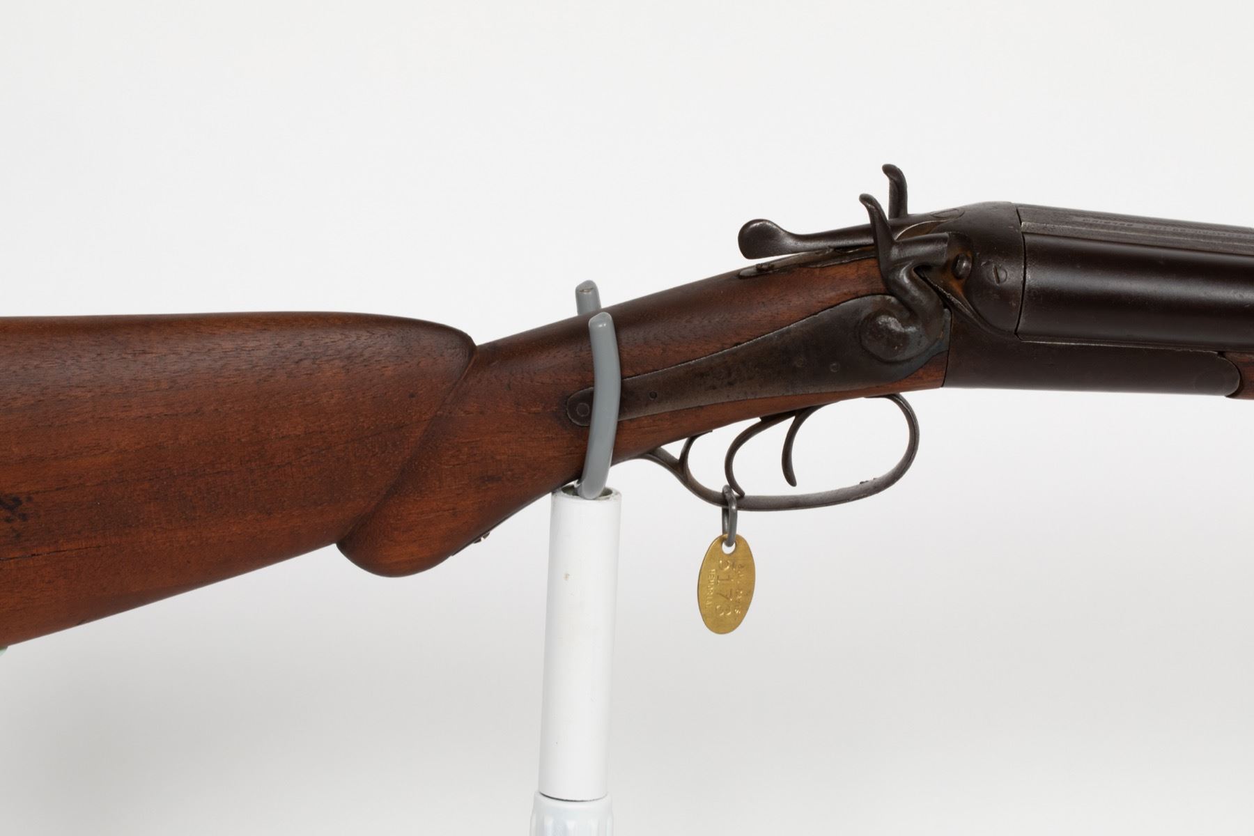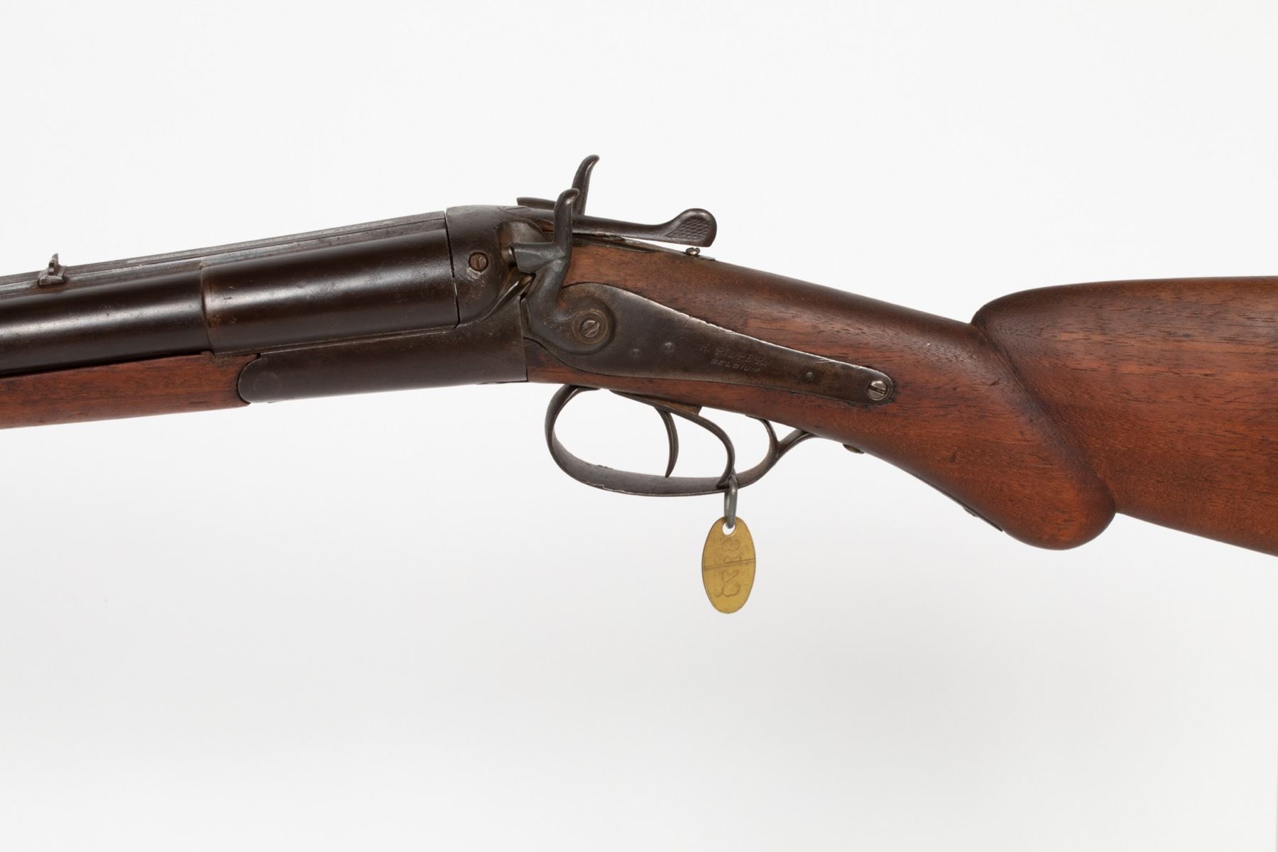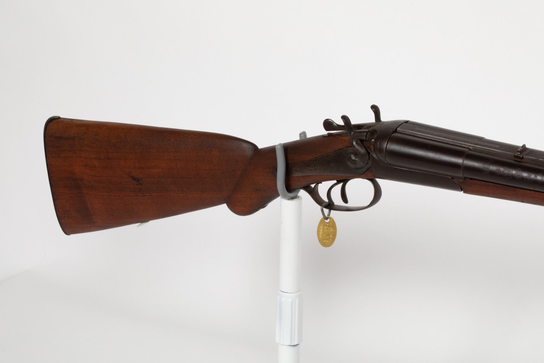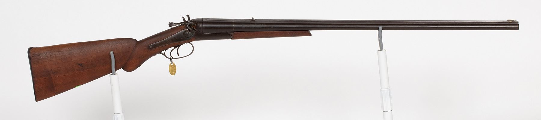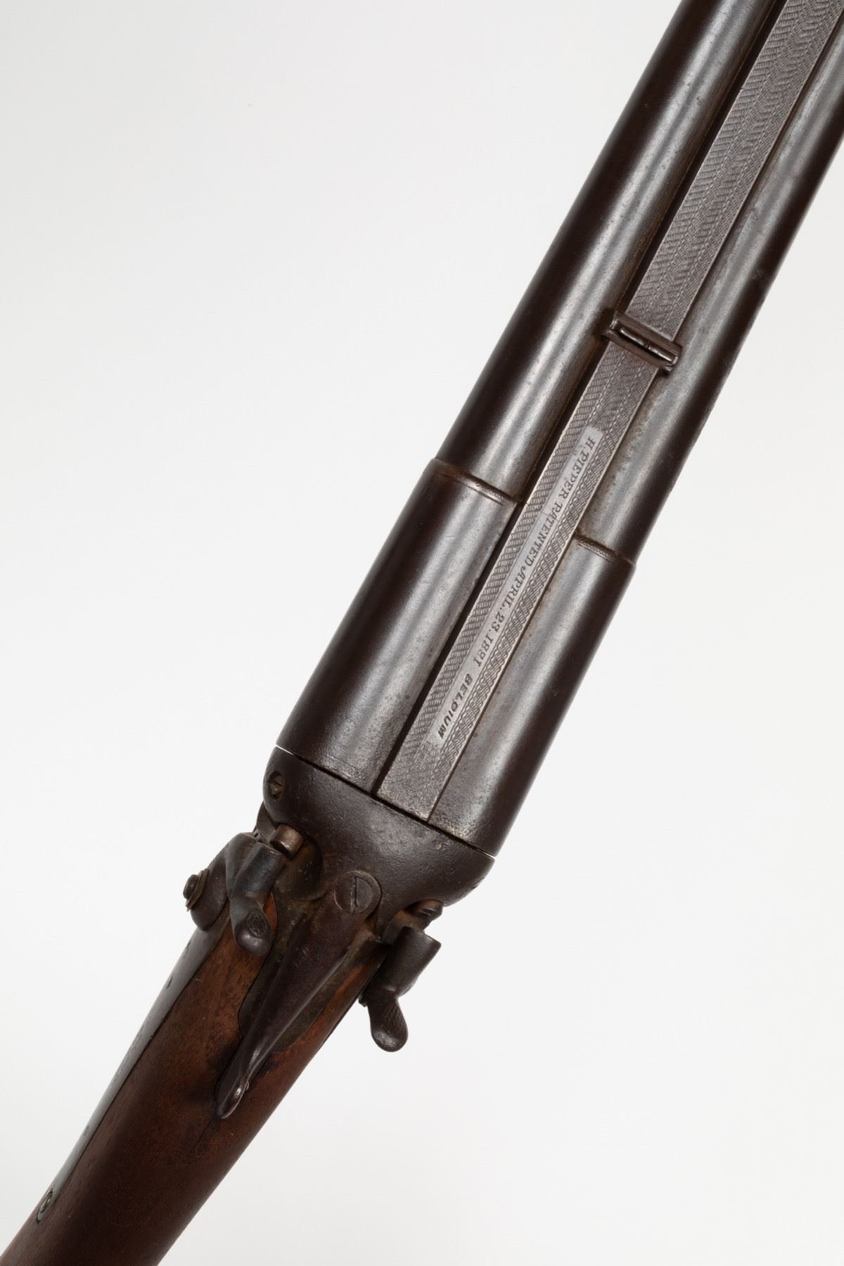 This is a back-action hammer shotgun by Pieper in 12 ga. and 8.4 mm rifle. In good condition with some wood shrinkage. SN: 121656, JMD Oval Tag: 5173, Condition: Good, >