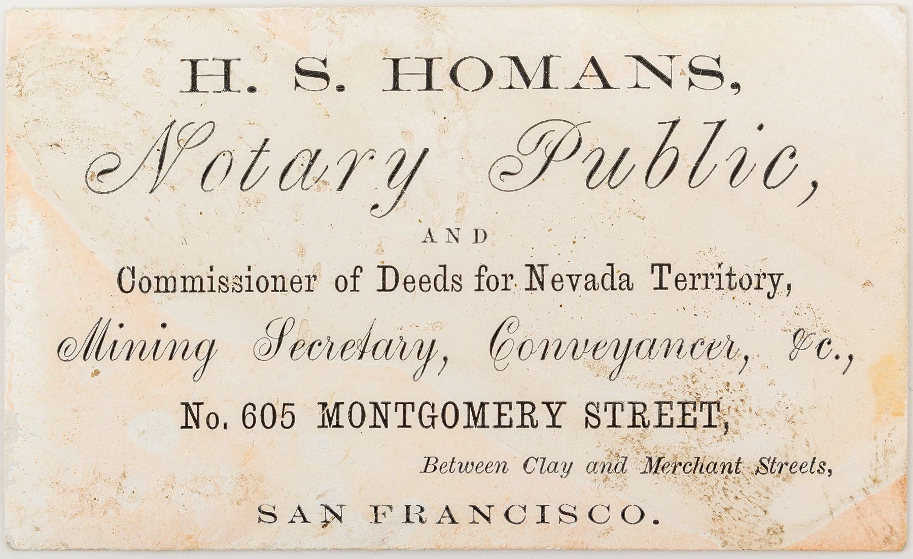 This card begs two questions: 1) What is a Commissioner of Deeds? A Commissioner of Deeds is an officer having authority to take affidavits, depositions, acknowledgments of deeds, etc., for use in the state by which the person is appointed. The office is similar to that of Notaries Public; thus, commissioners of deeds generally authenticate their acts with some type of official seal. 2) What is a Commissioner of Deeds for Nevada Territory doing in San Francisco? Unlike Notary Publics, a Commissioner of Deeds allowed easier access for one state to accept what another state had made legal by a Notary Public. And that is exactly why a Commissioner of Deeds for Nevada would be located in another state. During the territorial period Governor Nye and Secretary Orion Clemens appointed many such positions throughout California. Includes more background notes and copies of his appointment secured at the Nevada State Archives! Nevada