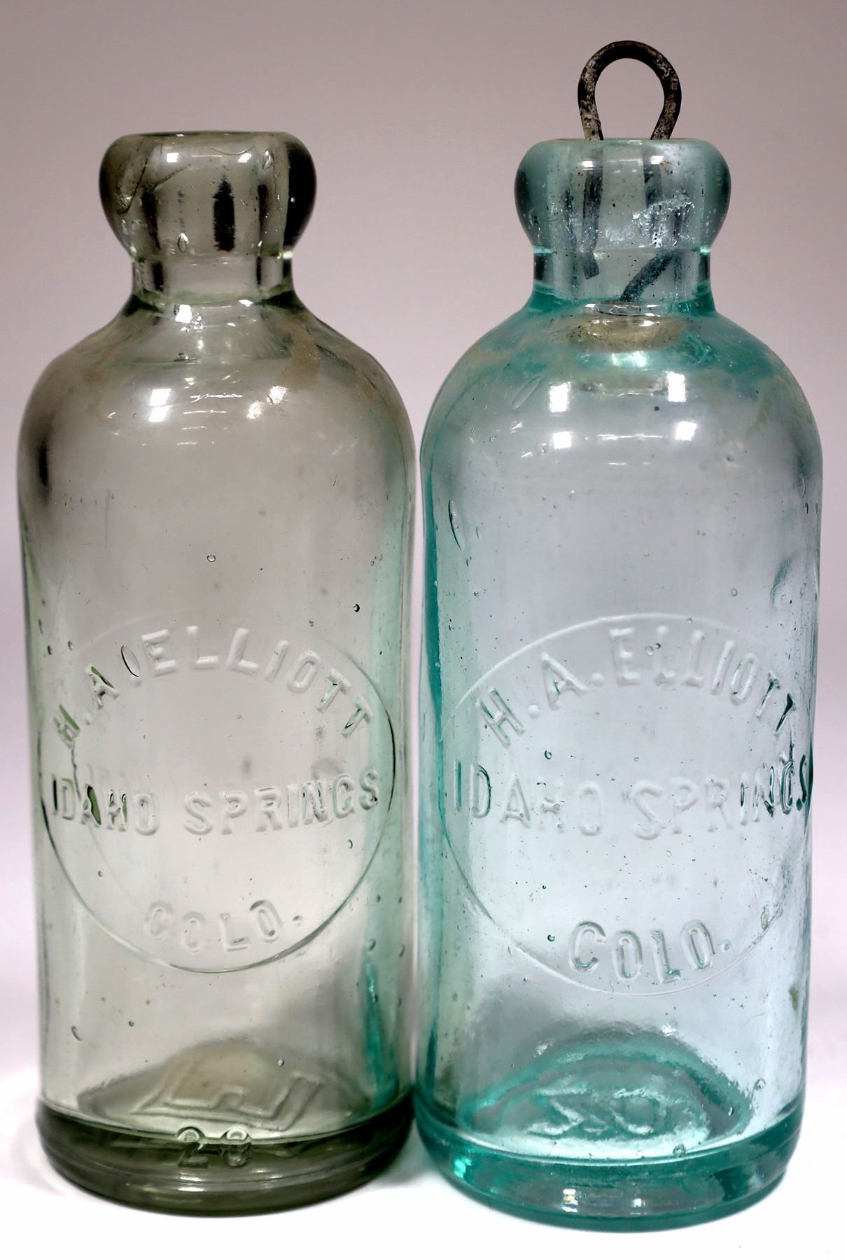 Clear and light aqua, H. A. Elliot/Idaho Springs/Colo. Clear has a top crack? No other apparent chips or cracks.