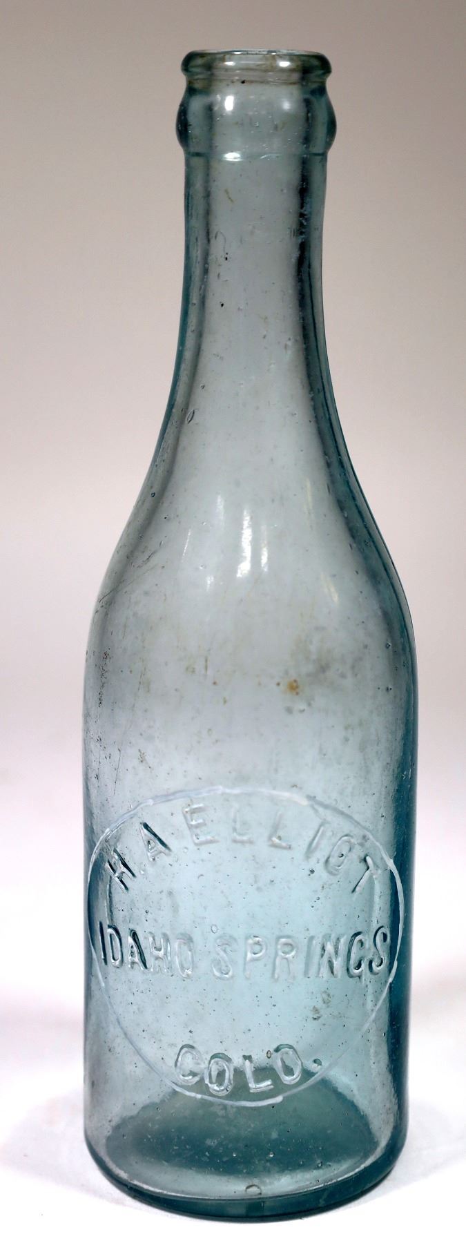 Light aqua white embossed crown top beer bottle. H. A. Elliot/Idaho Springs/Colo.