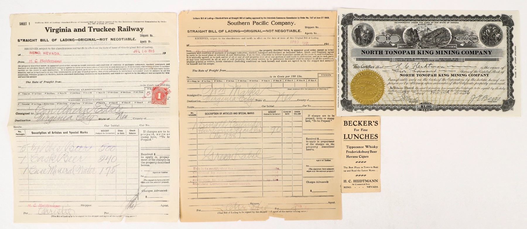 Lot of 4. Includes: North Tonopah King MC stock issued to Heidtmann in 1926; Virginia & Truckee Railway 1915 Bill of Lading for beer and mineral water to the Con Ahern Estate (proprietor of the Crystal Bar in VC); Southern Pacific Company bill of lading 1917 for carbonic acid to William Marks (prop. of the Crystal Bar in VC); and advertising card for Becker's Saloon. HC Heidtmann took over Becker's Saloon in Reno at the end of 1900. In 1906, he began managing the Wieland Bottling and Soda Works. He bought this in 1912. For more information, please see Volume One of the Nevada Bottle Book.