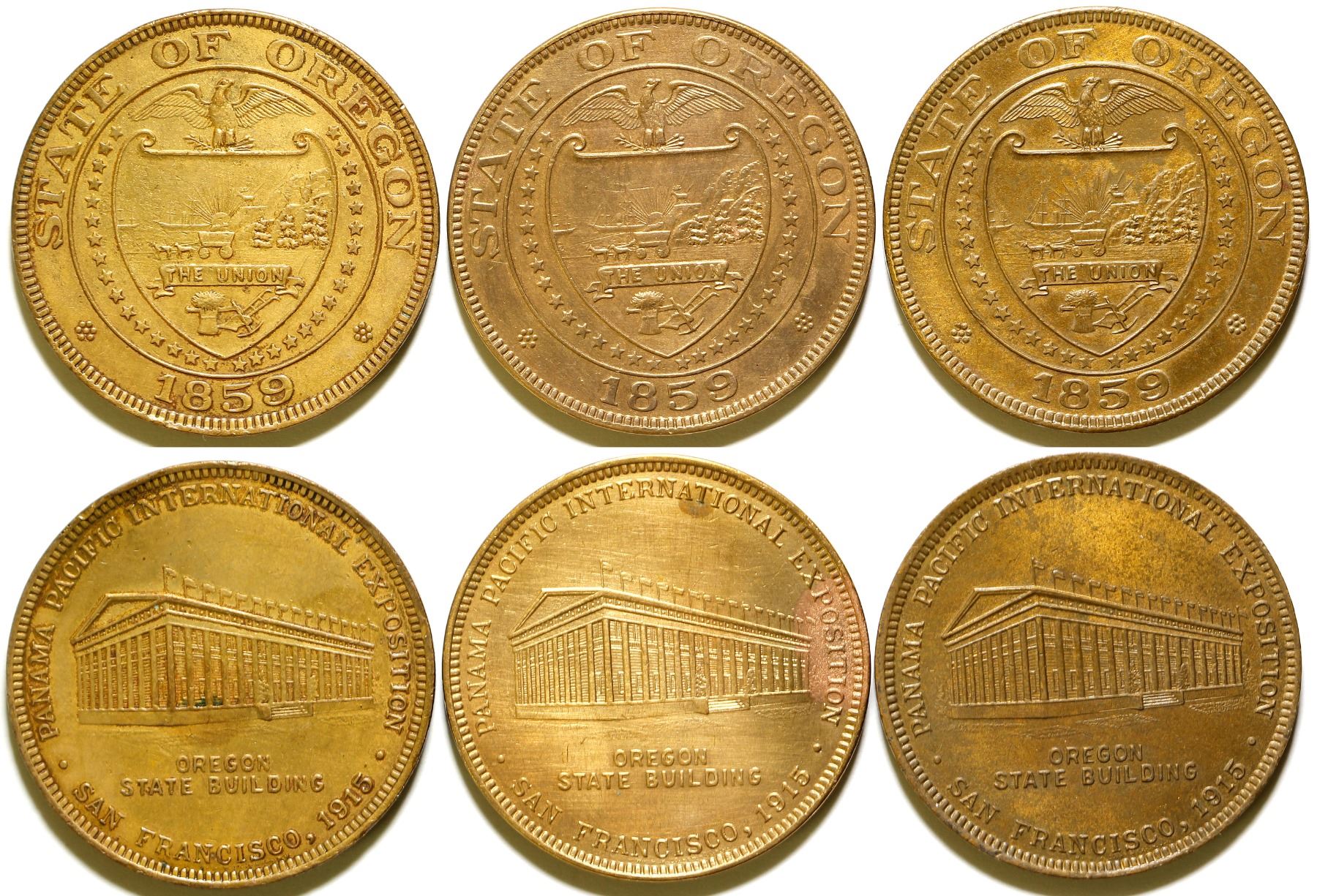State of Oregon PPIE, bronze, 38 mm, R-3. Three pieces. Salvatore Falcone Collection.
