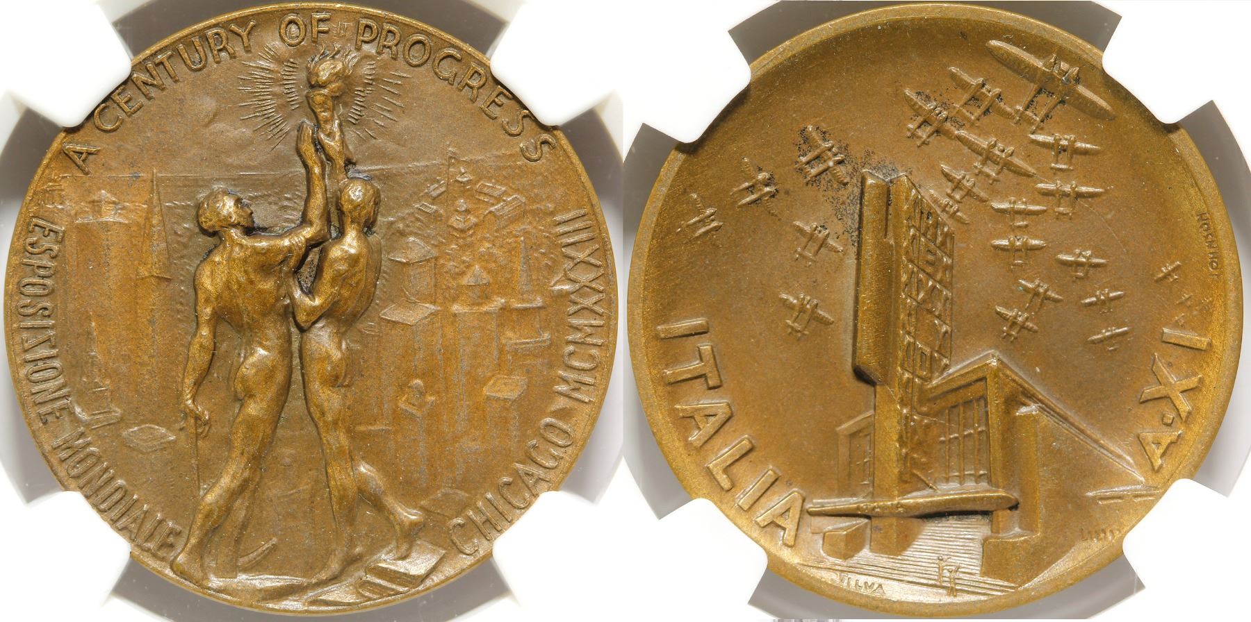Italian Exhibit Dollar, struck by Stefano Johnson, Milan, Italy. Beautiful high relief. NGC graded MS 64 BN. Salvatore Falcone Collection.