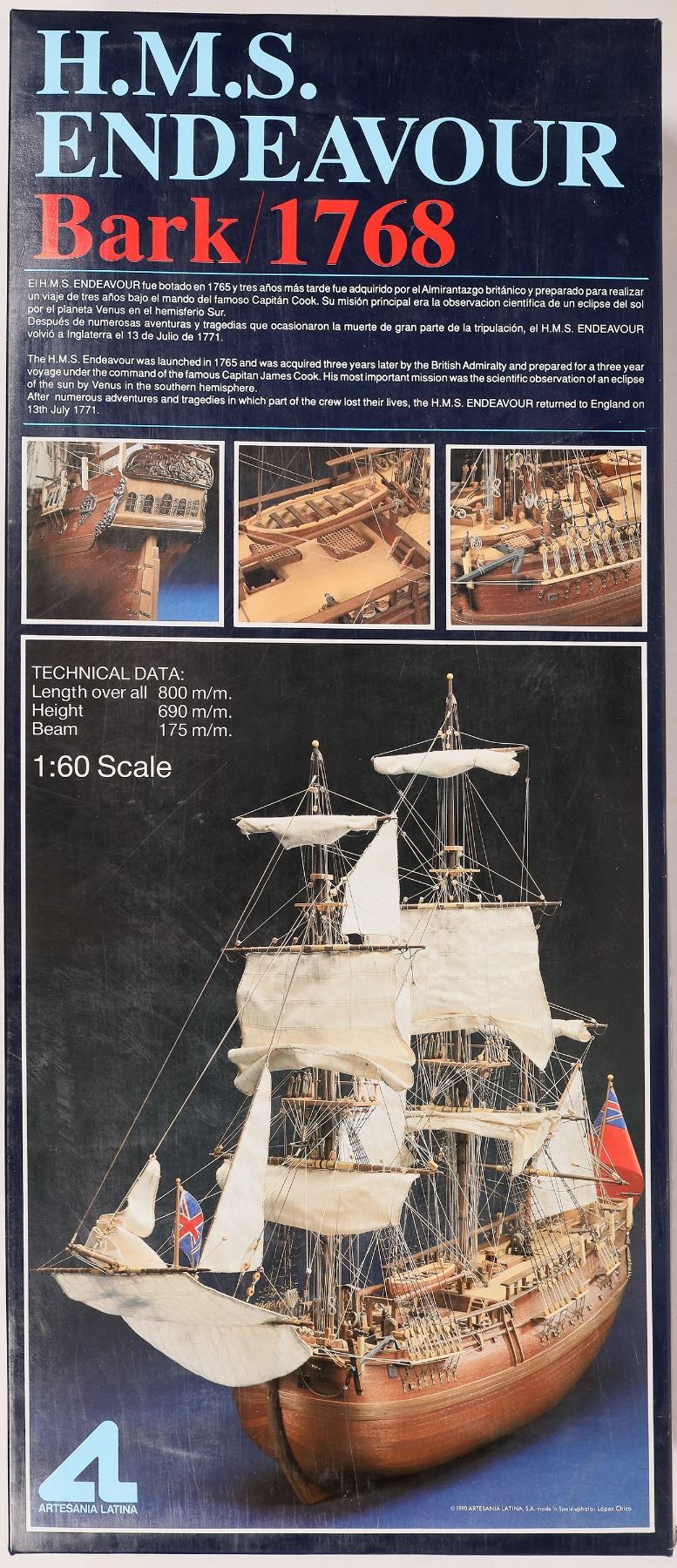 New in box high quality ship model. HMS Endeavor 1:60 scale by Artesania Latina. Vessel of Captain James Cook from the 18th century noted for his adventure concerning the discovery of Australia. Box 2.5x26x11", one corner taped.