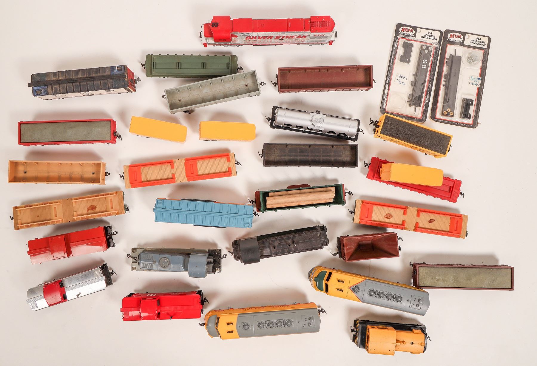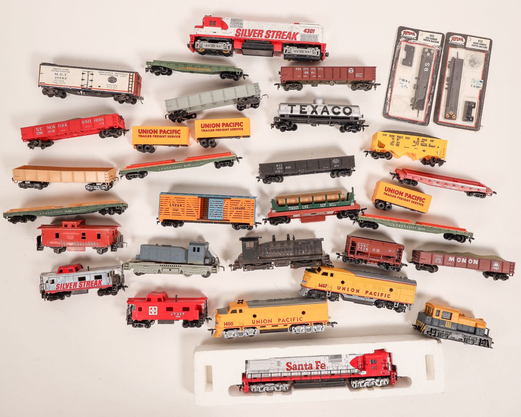 Lot of 32. 1. Locomotives : #4301 Tyco Silver Streak Loco and Caboose. Lifelike Union Pacific #1400 &1407 A&B unit. #1102 Tyco Santa Fe diesel. #332 RSO (Yugoslavia) Santa Fe yard switcher. Yard switcher , diesel, made in W. Germany, no markings (need repair). Revell , Diesel yard engine, no markings, Black.