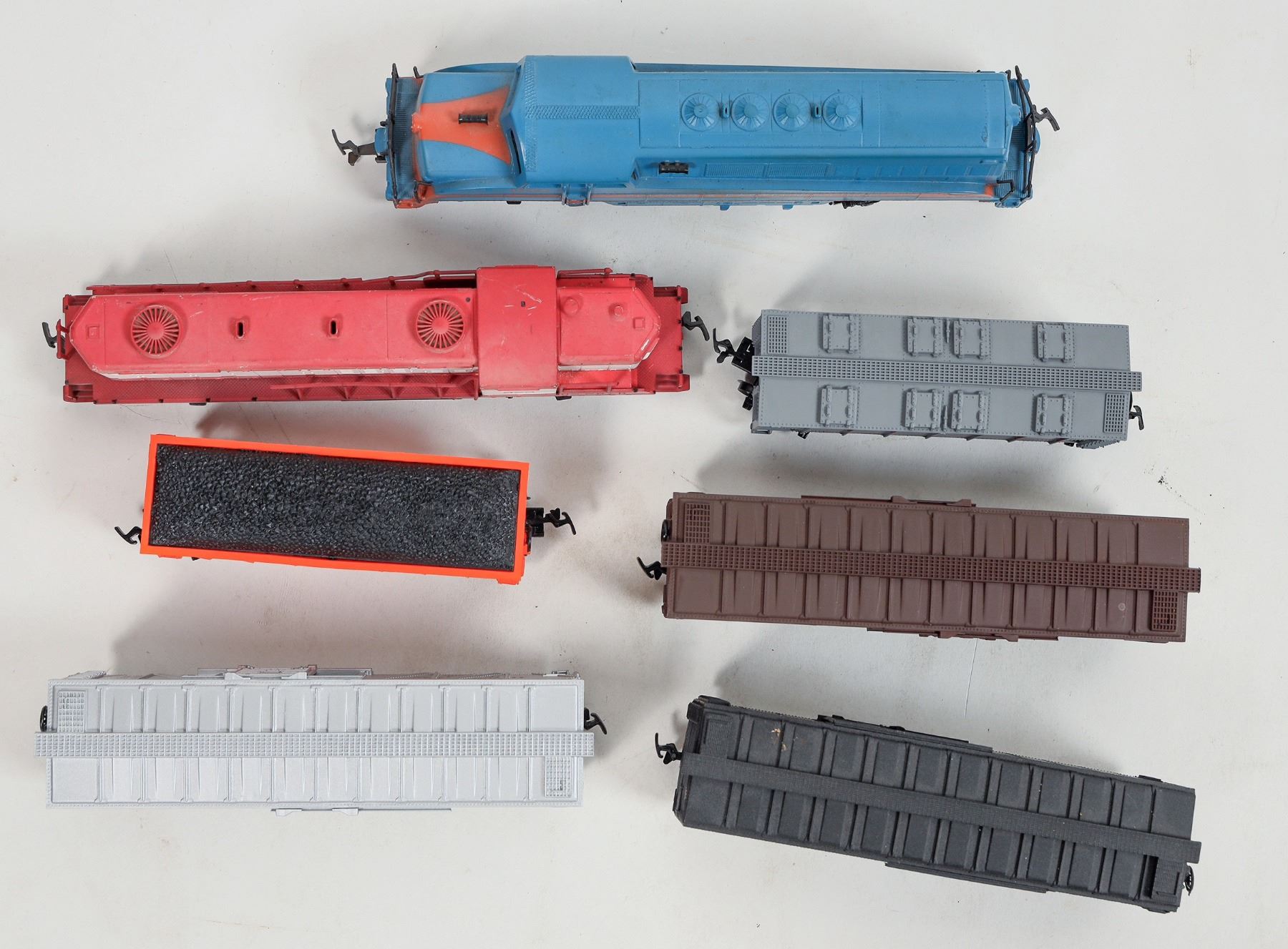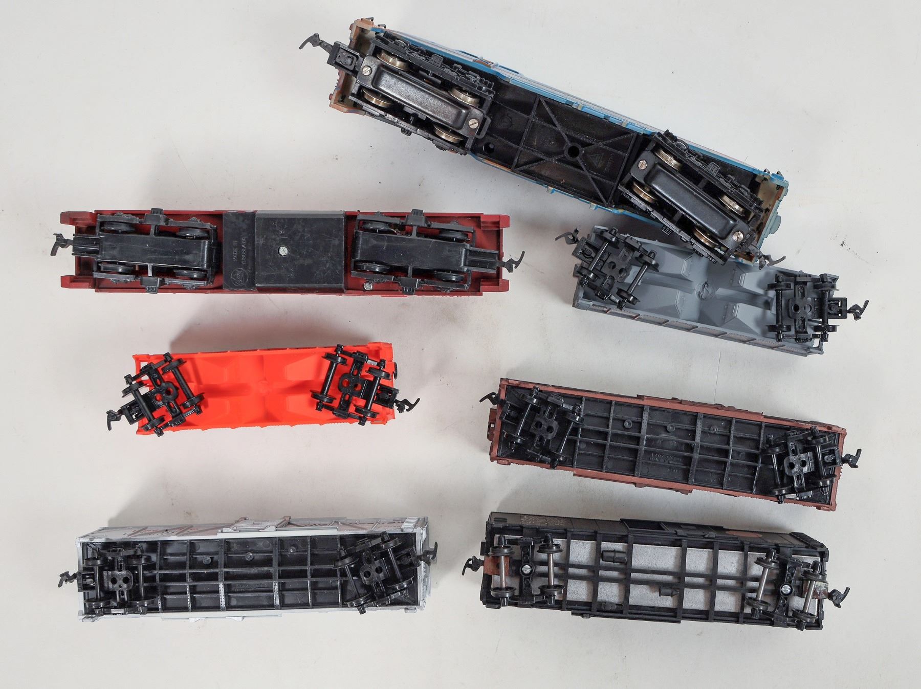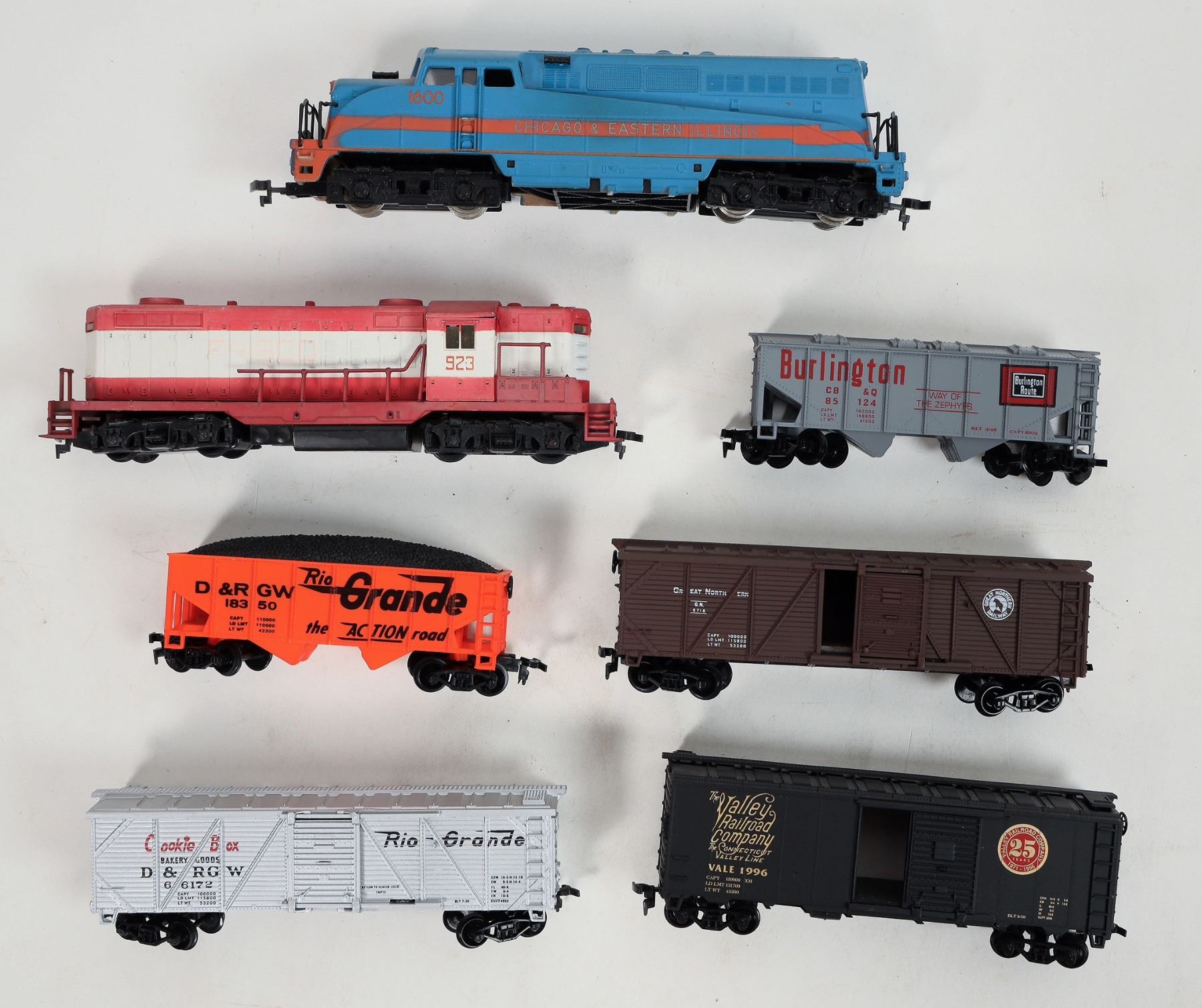 Lot of 7. AHM Chicago Eastern Lines diesel #1600, never run. AHM Frisco #923 diesel dummy, D&RGW Cookie Bo's box car, Burlington double bottom dump, D&RGW double bottom dump, Valley RR box, Great Northerns box. Always in display, never run in a layout.