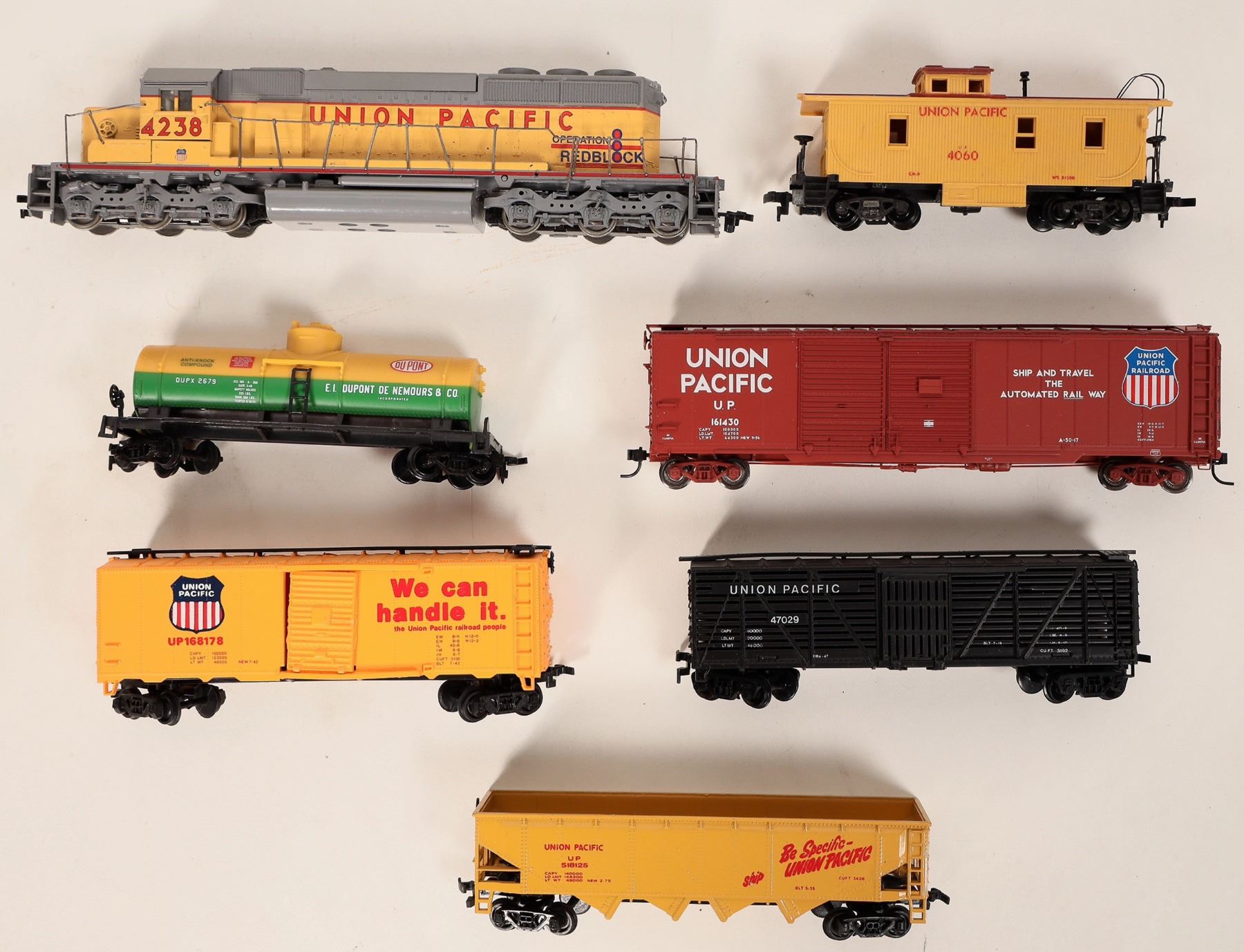 Lot of 7. Athearn SD40-2 diesel operation Roadblock, highly detailed and weighted w/50' Up 161430 box car, 168178 box car, 47029, livestock, car, bottom dump, Dupont single dome tanker and Revell 4060 weighted caboose. All in C7 cond. Items were on display since new and never run.
