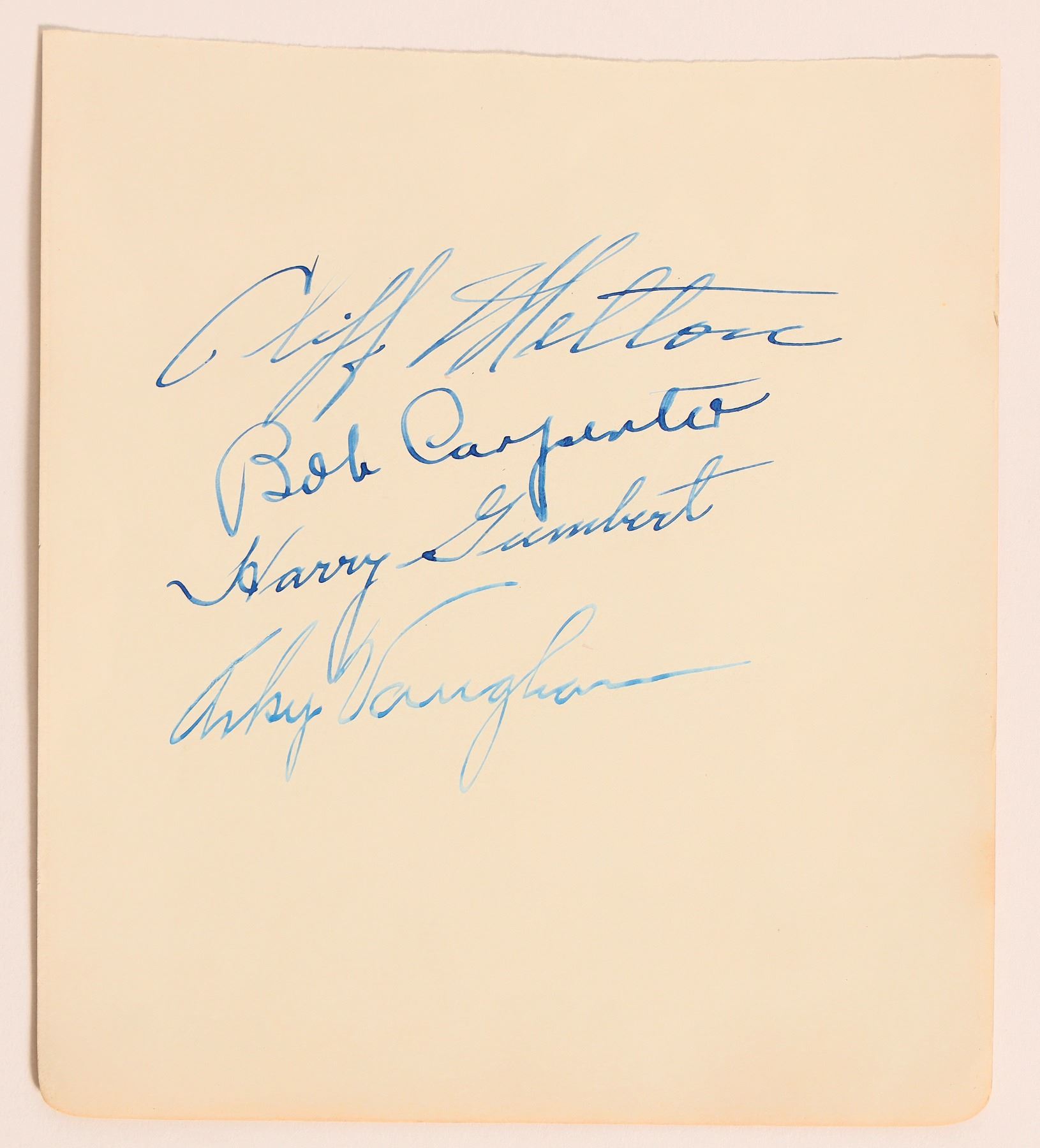 Arky Vaughan, the Hall of Fame shortstop, heads the list of ballplayers from the 1930s & 1940s who signed this autograph cut. Also included are Cliff Melton, pitcher for the New York Giants, Bob Carpenter, pitcher also of the New York Giants pitching ate with the Giants, Harry Gambert. All signatures are sharp. There are also stats included. Please see photos for more details