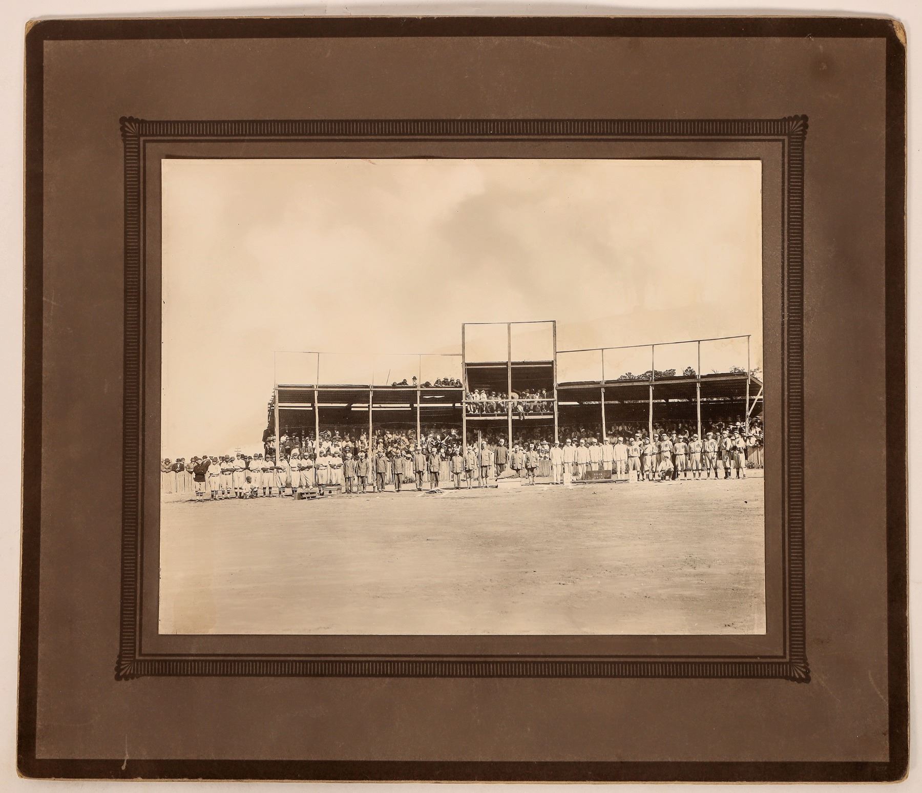 Panoramic photo of an unidentified Utah ballpark in the coal mining region, with two teams, the Hiawathas and King Koal. It looks to be taken in the early 1900s. Interesting shot of baseball history. It measures 7.5"x 8.5" and 12"x 14" on its cardboard mount. Please see photos for more details.