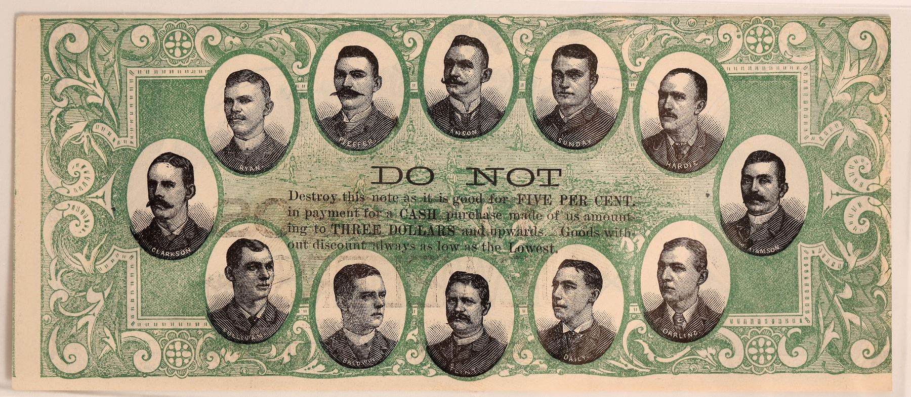 Baseball themed scrip for Hayes Bros. Jewelers Austin , Minn. The obverse has a picture of National League co-founder Albert Spalding, while the reverse shows pictures of the players from the 1887 Chicago White Stockings. It's good for a five percent discount on purchases of $3 or more. Novel. Please see photos for more details. Austin Minnesota