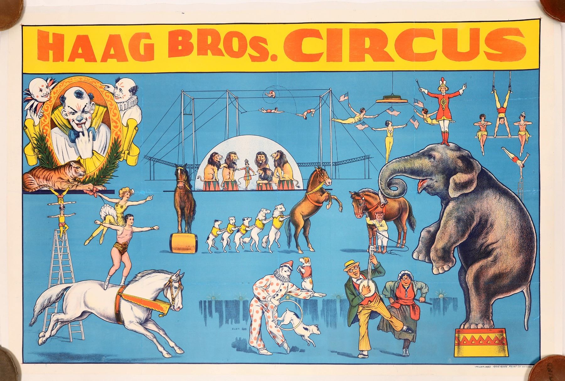 This Haag Bros. Circus poster is paper on heavy canvas at 29 in. X 44 in. Printed by the Milwaukee-Riverside Print Co. #3272, date unknown. Very good condition with a pin hole in each corner. From the Stuart Mackenzie collection. Colors are vibrant.