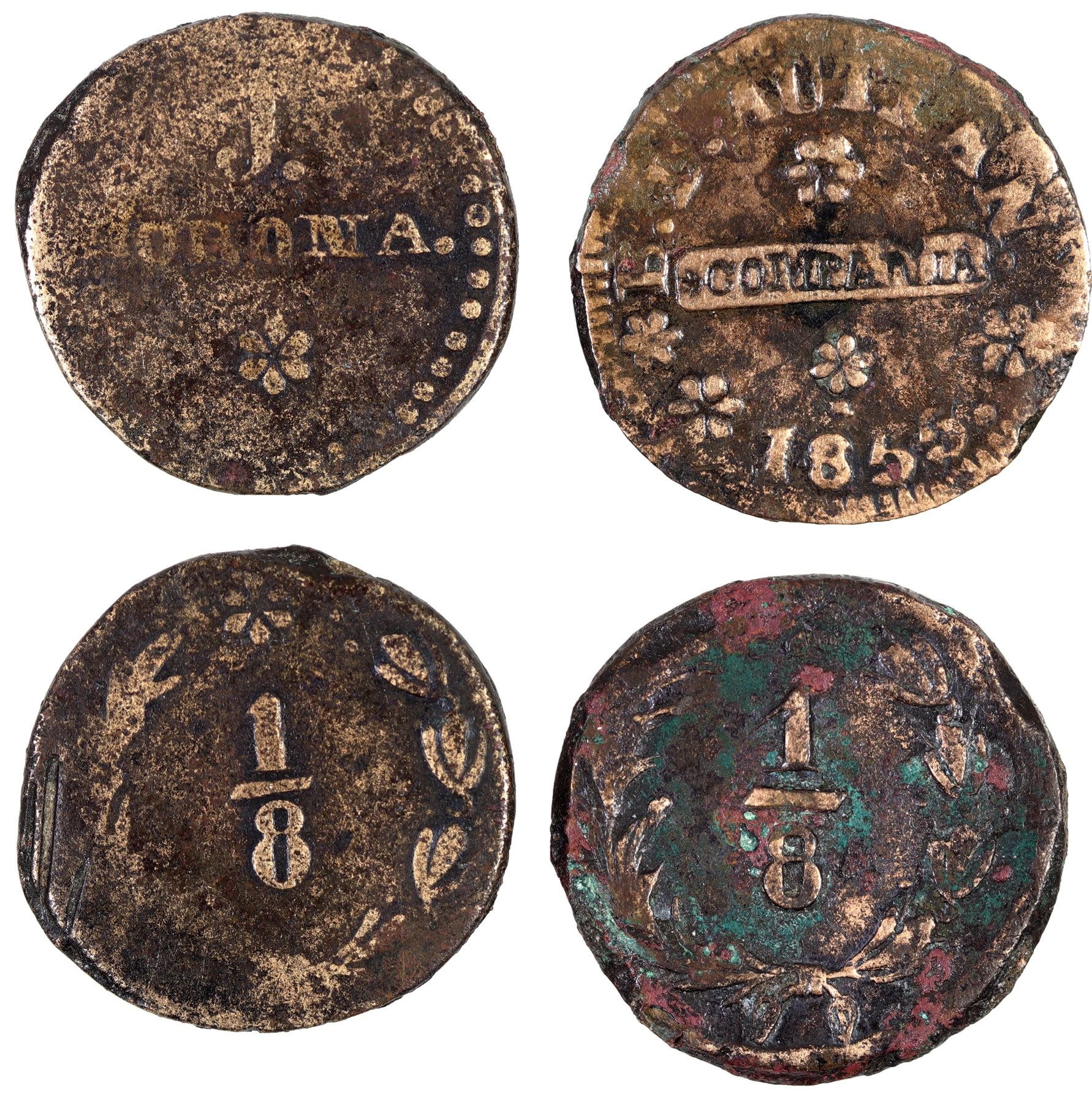Two difficult to read tokens each with one over eight on the reverse. One dated 1855 from some compania. The other lettered "J./ Horona". Br., 22 mm. City: State: Date: