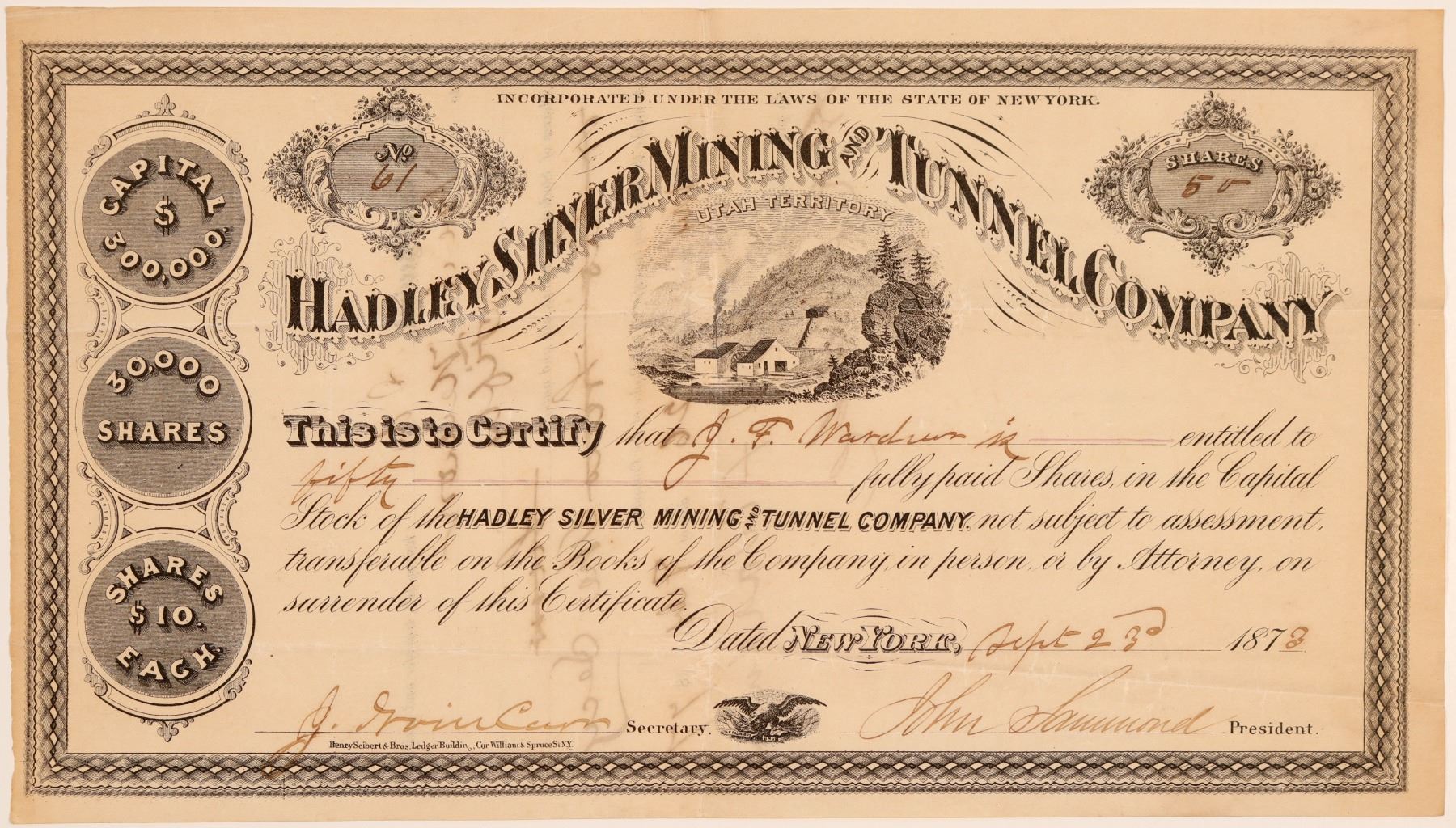 "Utah Territory" printed under title. Inc. in New York. No. 61, issued for 50 shares to JF Wardner on Sept. 23rd, 1873 in New York. Signed by president John Sammon and secretary J. Irvin Carr. Not cancelled. Black border and print. Vignette of mine and mill on mountainside. Printed by Henry Seibert & Bros, NY. Folds, creases, and toning. 6.25 x 11" We could not locate this mine. Not in Filer or other Holabird indexes. No mentions found on newspapers.com, CDNC, or Google.
