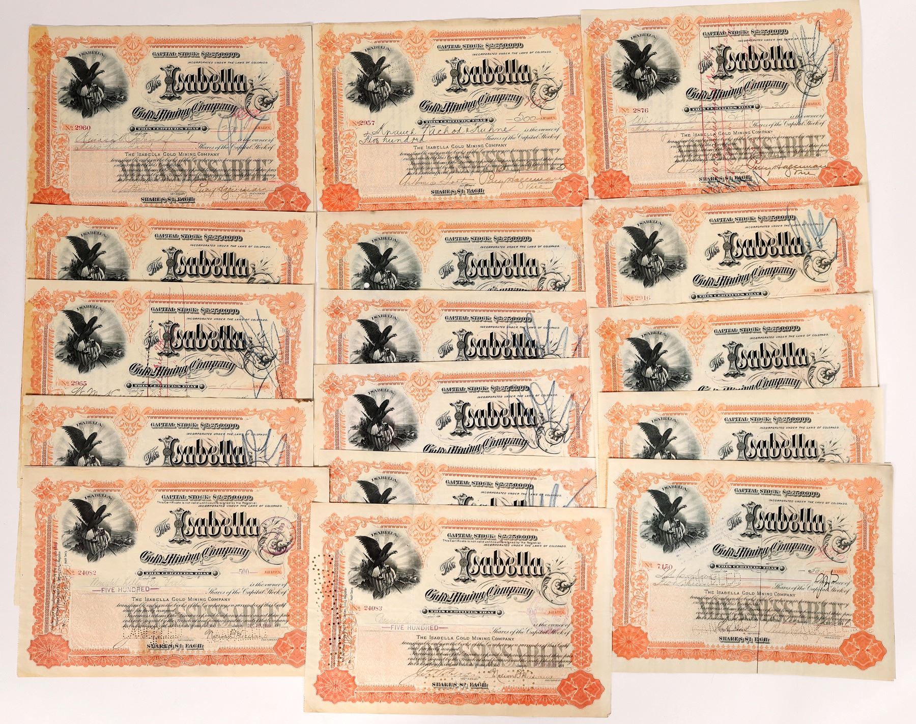 Twenty-one Isabella Gold Mining Company stock certificates issued 1895-1896. All signed by J.J. Hagerman, an important Colorado railroad and mining figure who owned the Mollie Gibson and Isabella mining companies as well as the Colorado Midland Railroad. He was one of the mine owners who precipitated the Cripple Creek Miner's Strike of 1894. Later in life, he also got into ranching in New Mexico. All three stocks are punch cancelled with folds and small rips. Cripple Creek Colorado