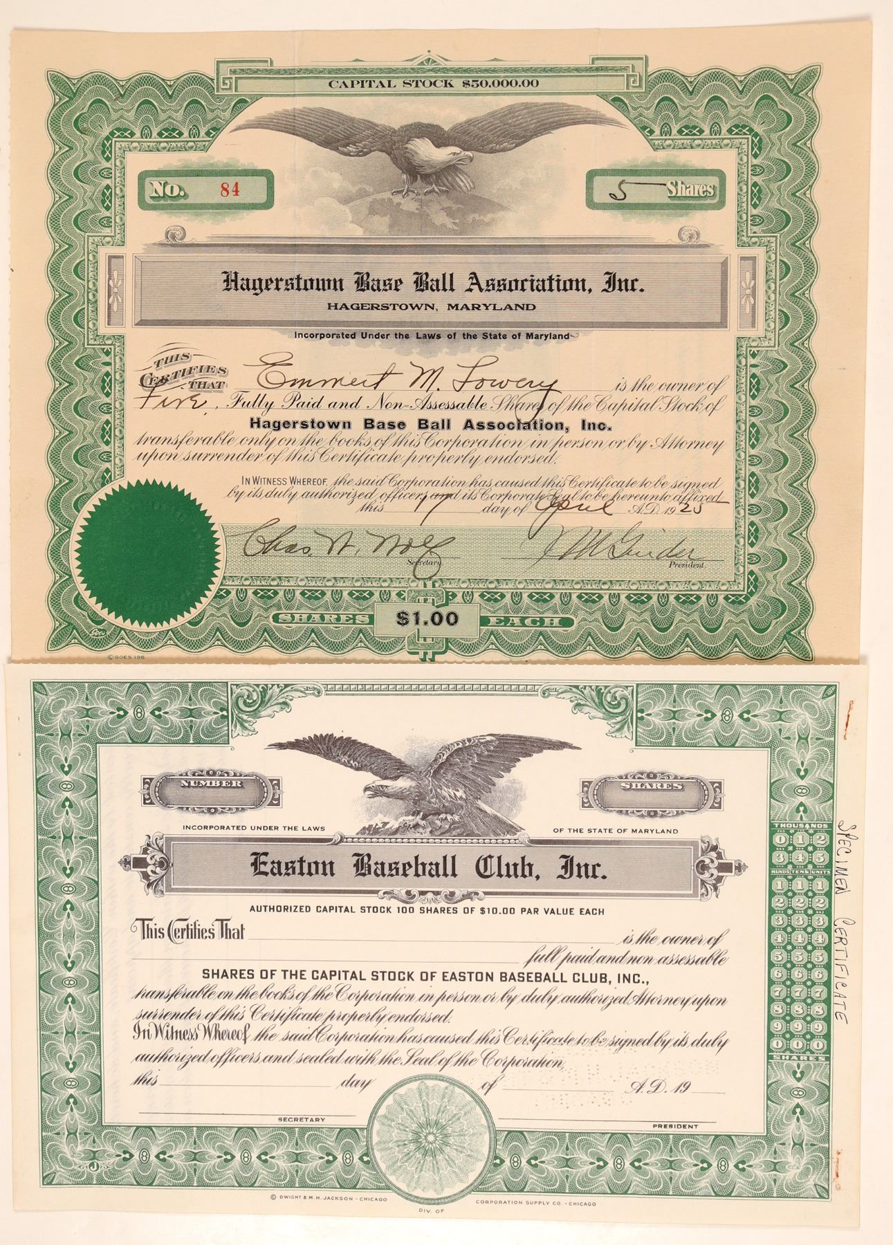 1) Hagerstown Base Ball Association. # 84 for 5 shares to Emmet(?)Lowery. Signed by president Guider. Some small edge nicks and heavy vertical folds at bottom. 2) Easton Baseball Club Specimen Cert. Excellent condition. Ken Prag Collection