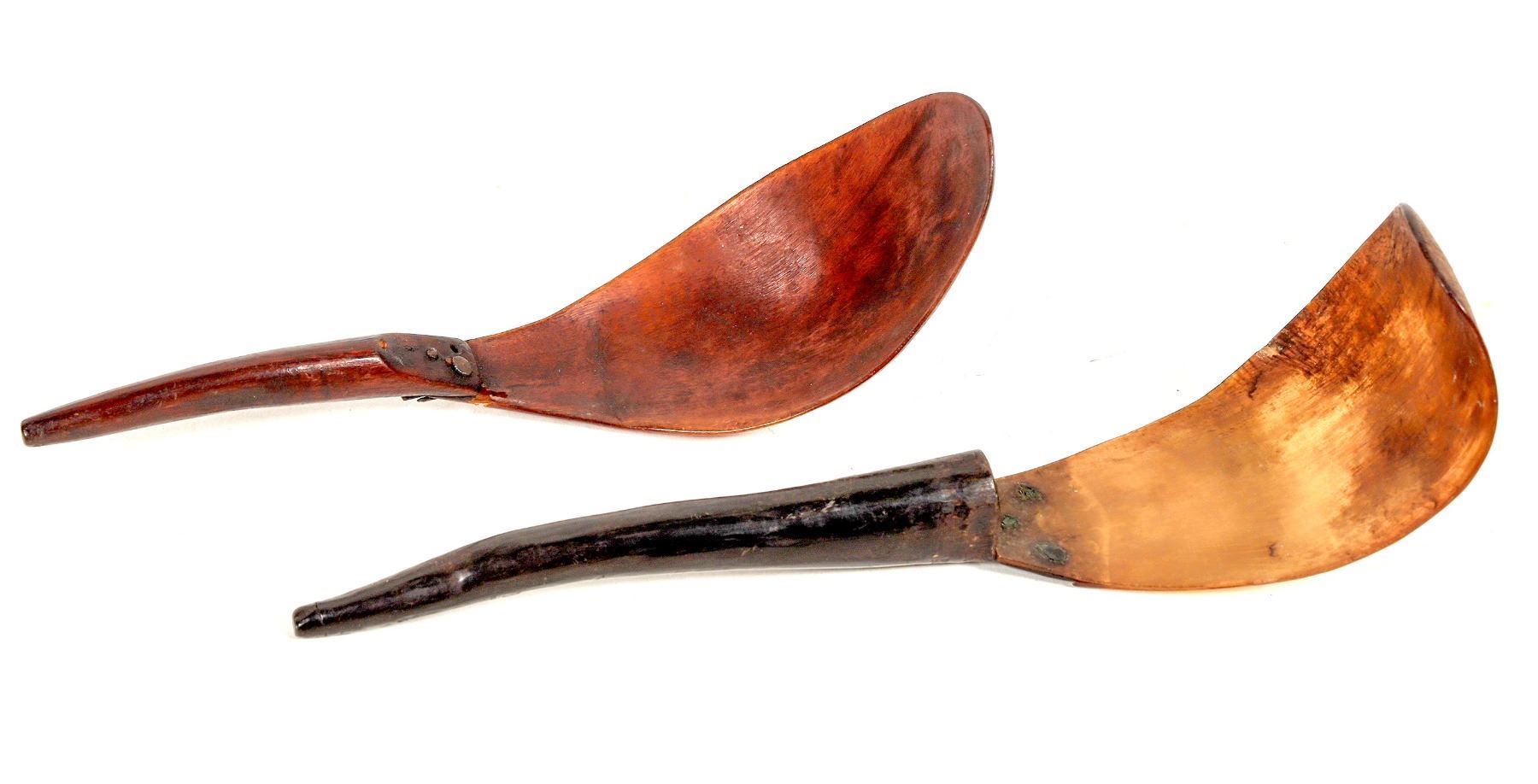2 different c. 1840-60 Haida goat horn feast spoons. Darker patina, 8x2.25"-1 empty attachment hole, some bone loss near handle, 2 different attachment materials. Lighter patina, 9x2.5"-drilled? hole near bone curve. Please inspect.