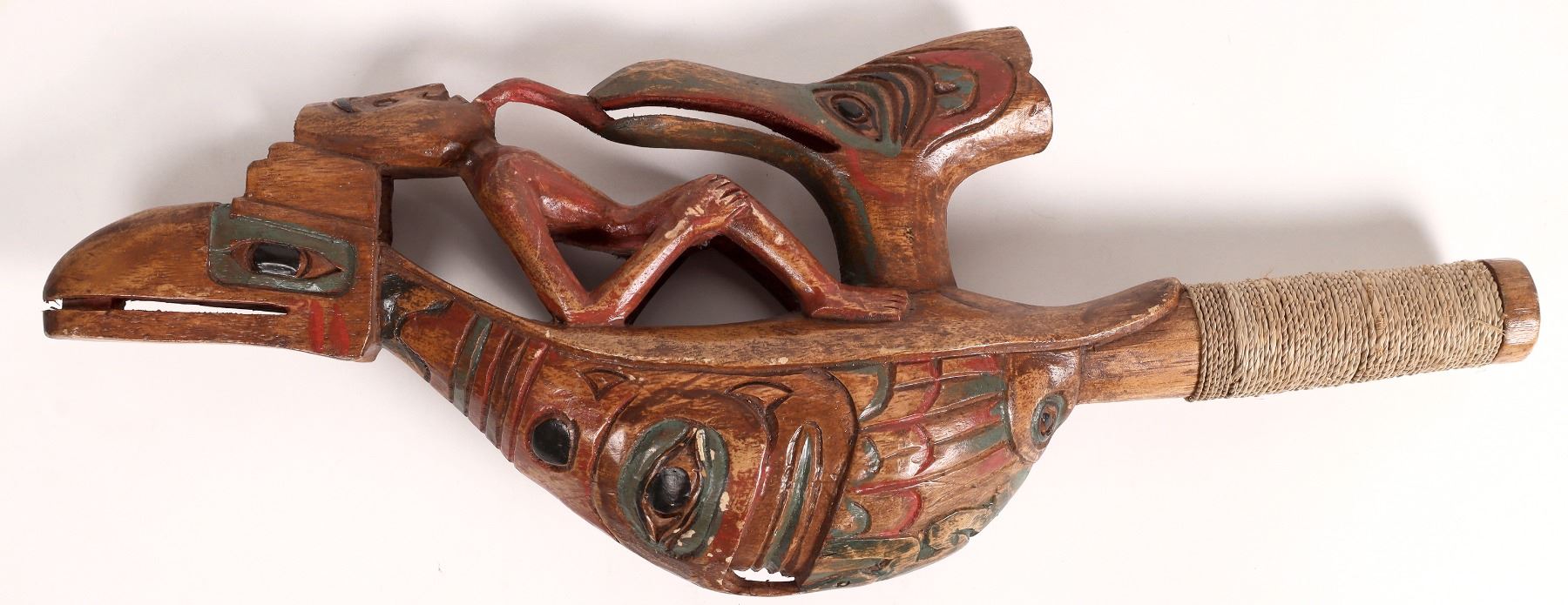 Choice old Haida Raven rattle, 6" x 18.5" x 3", carved, painted (worn) wood, twine wrapped handle. This is a classic Raven rattle, possibly in the style of Charles Edenshaw (1839-1920), nephew of Albert Edward Edenshaw, one of the earliest known carvers of Raven rattles. The oldest known is reportedly from 1804. Charles Edenshaw was a major artist, carver, sculptor of all things Haida. He regularly sold to collectors, and many of his pieces are in all of the great museums today. Edinshaw came from lineage of the Raven "moiety" (people.)The rattle has significant wear on the paint surfaces. It has been in th same family collection for decades, but it's ultimate provenance is unknown, as are many or most Pacific Northwest older antiquities, particularly those purchaased by gold seekers of the Nome and Alaska/Yukon Gold Rush, circa 1898-1910. c.1898-1910